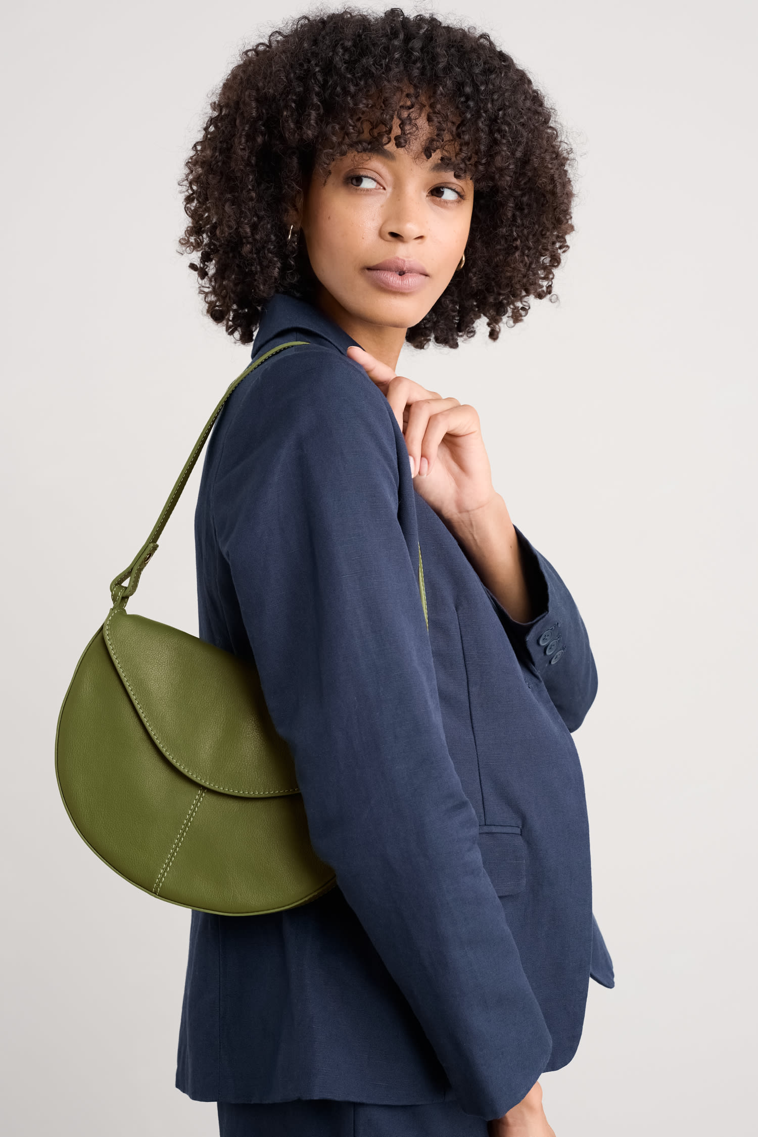 A stylish shoulder bag with a neat, semi-circular shape, crafted from fine LWG leather. The classic front flap conceals the easy-to-use popper fastening, and inside, there’s a useful slip pocket and recycled polyester lining in a smart contrasting colour. The leather strap is non-adjustable for a clean finish.