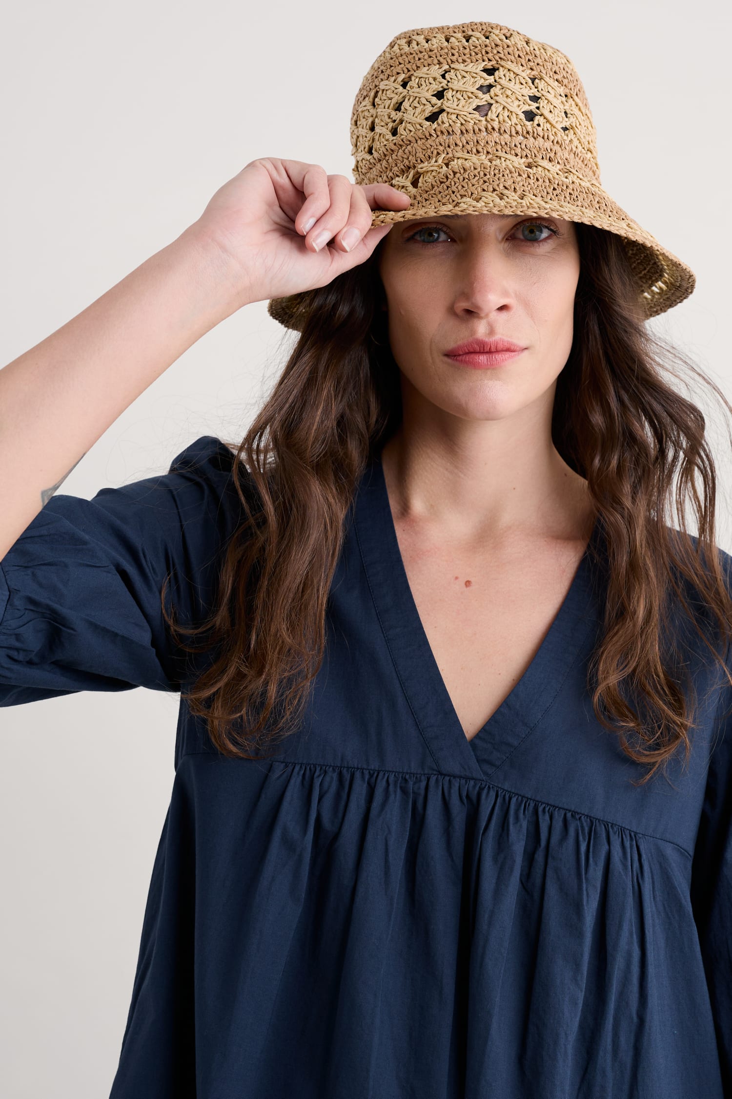 Inspired by classic garden hats, with a deep crown and a brim to shade your face and neck. Our sunhat is cleverly crafted from paper, with a delicate crochet pattern adding character. The perfect piece to see you through the summer.