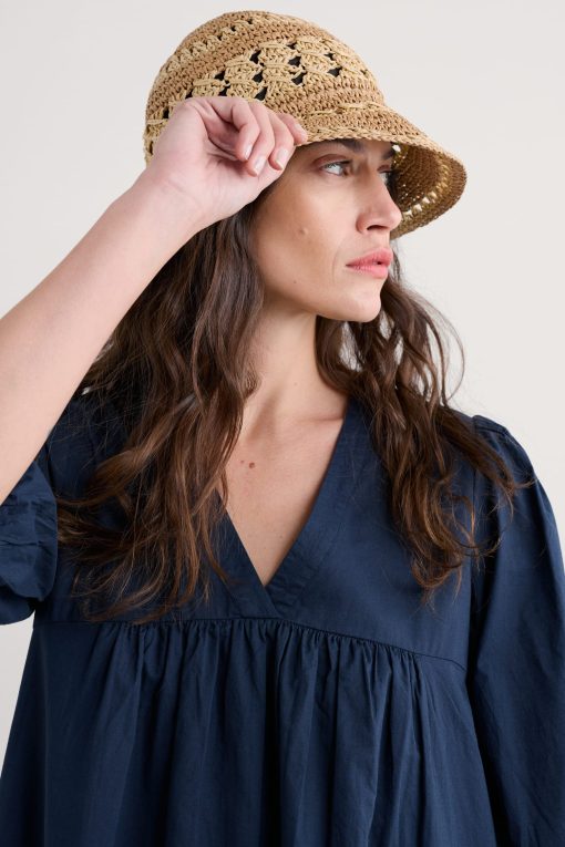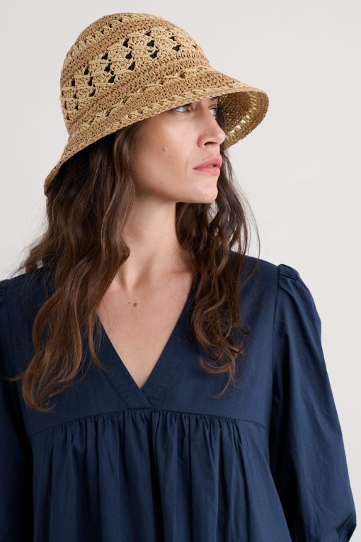 Inspired by classic garden hats, with a deep crown and a brim to shade your face and neck. Our sunhat is cleverly crafted from paper, with a delicate crochet pattern adding character. The perfect piece to see you through the summer.