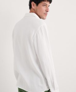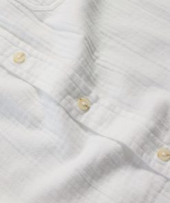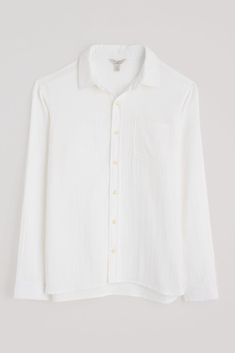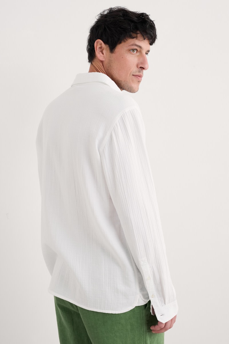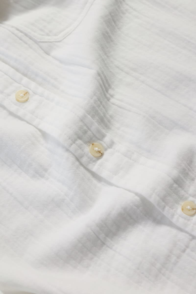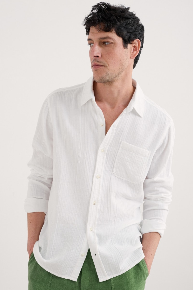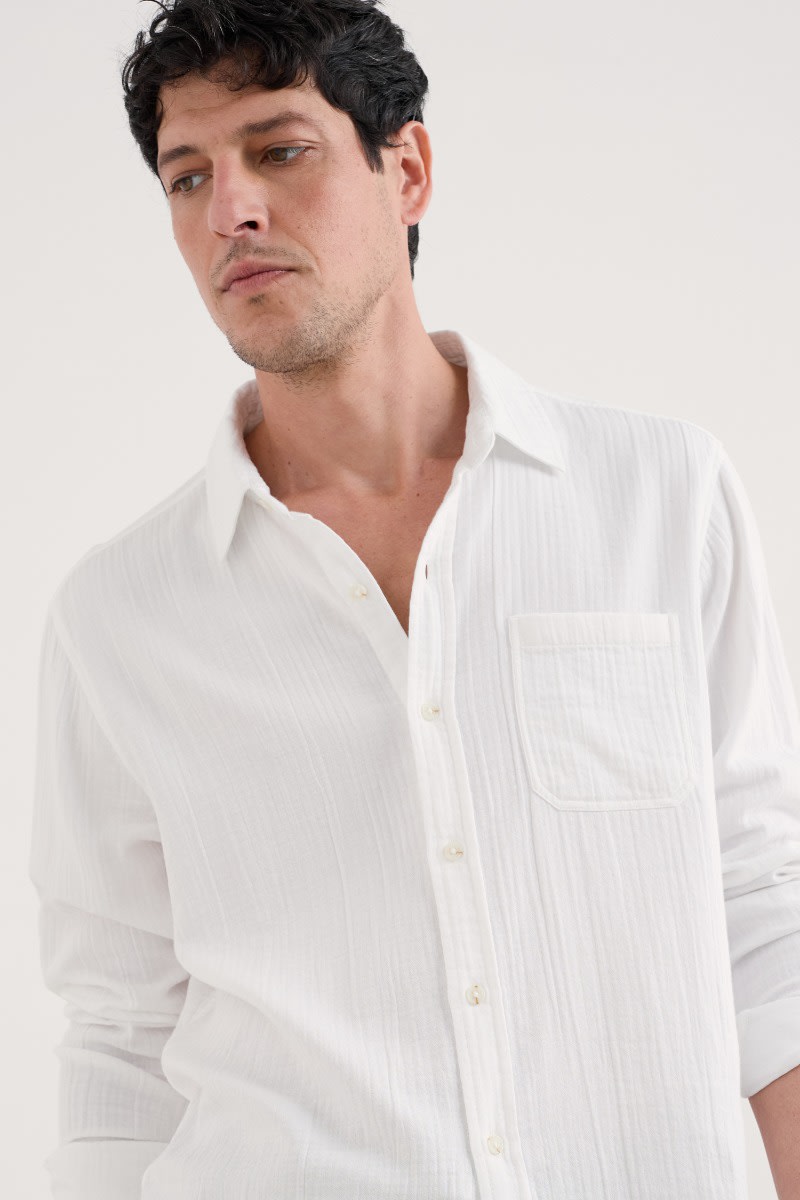 A relaxed fit shirt, made from GOTS-certified organic cotton. Its soft, almost springy handfeel is thanks to the double gauze construction, created by stitching two fine layers together. This creates a lightweight and gently textured fabric that’s perfect for summer wear. The mock horn buttons on the placket and cuffs provide a touch of contrast, while the chest pocket and split side hems add classic smart-casual details.