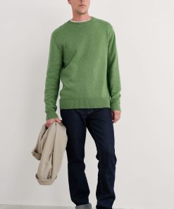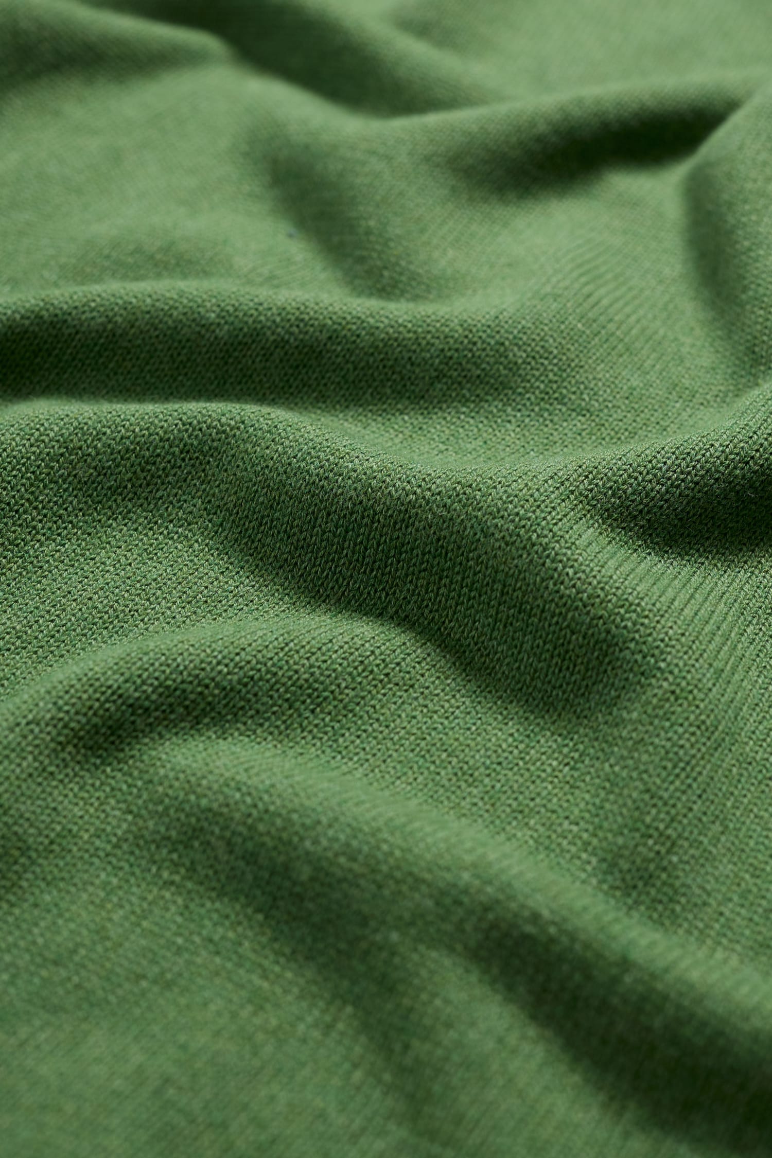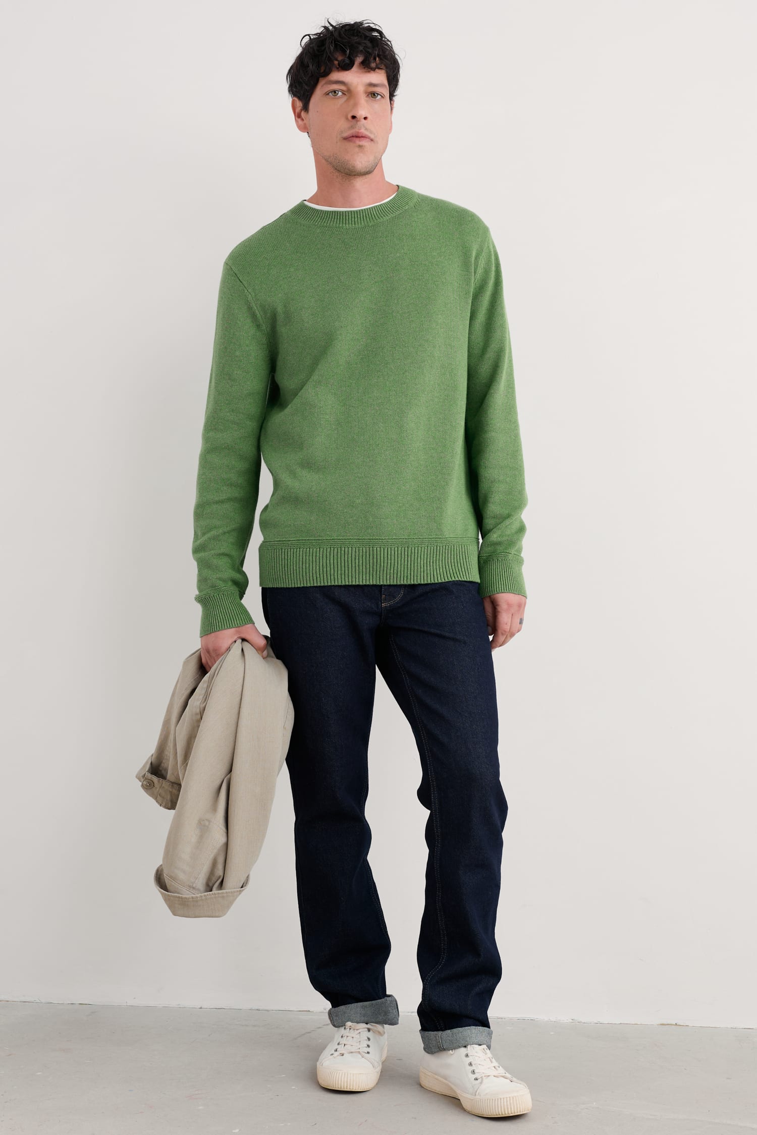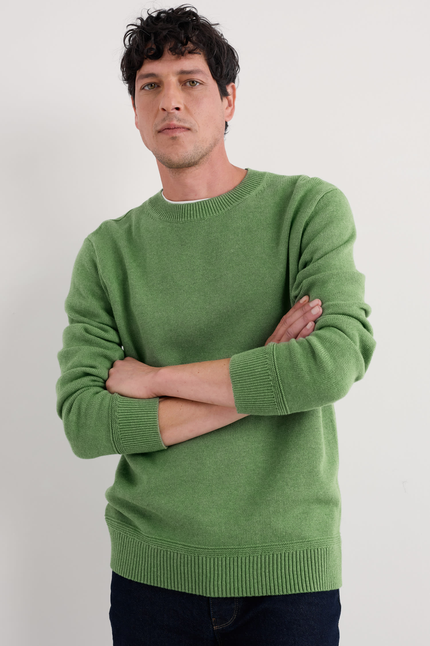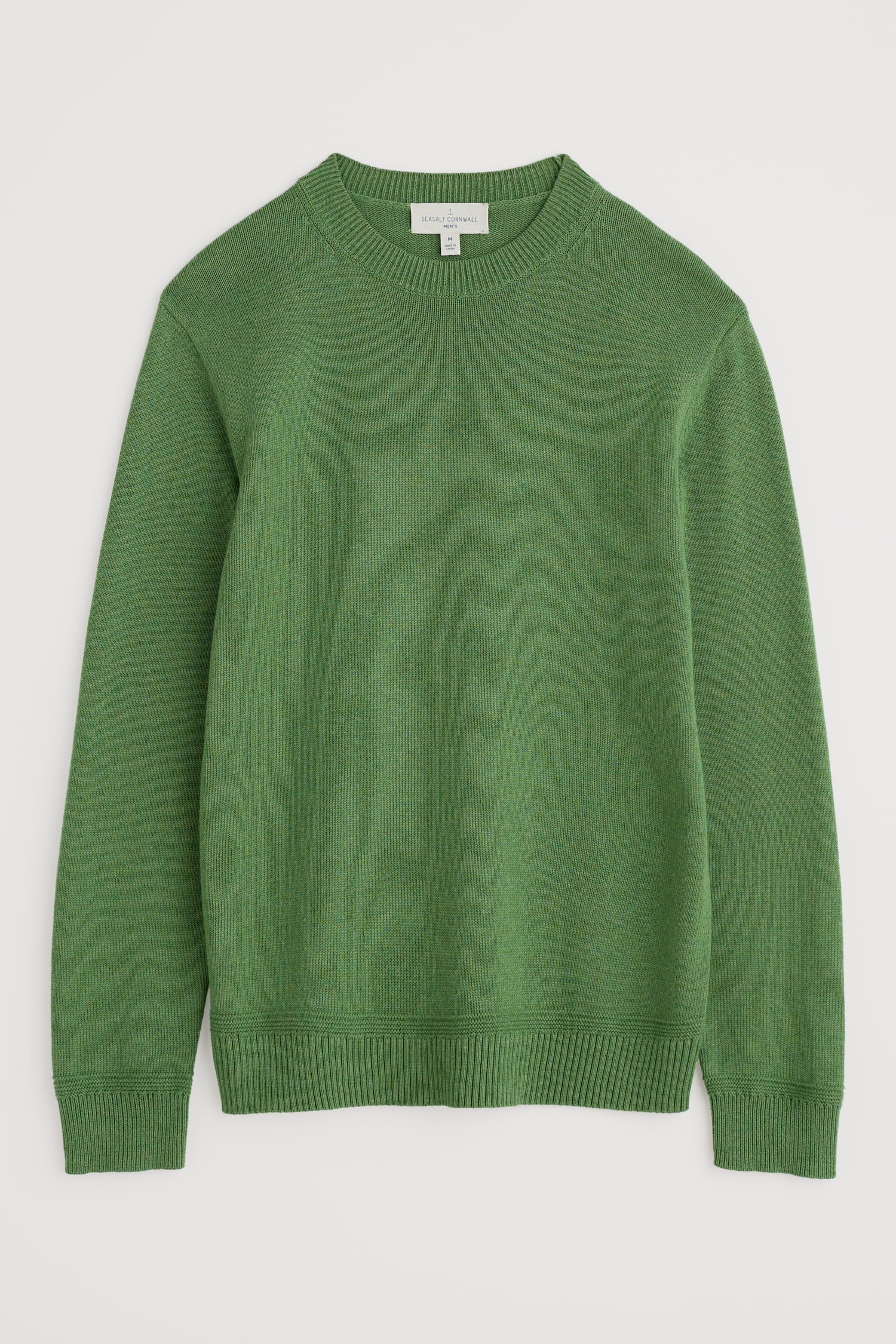 A timeless organic cotton jumper for light and breathable warmth. The all-over 7 gauge jersey stitch gives it a smooth, comfortable feel, while the ribbed cuffs and hem have a subtle racking detail just above for a little subtle structure.