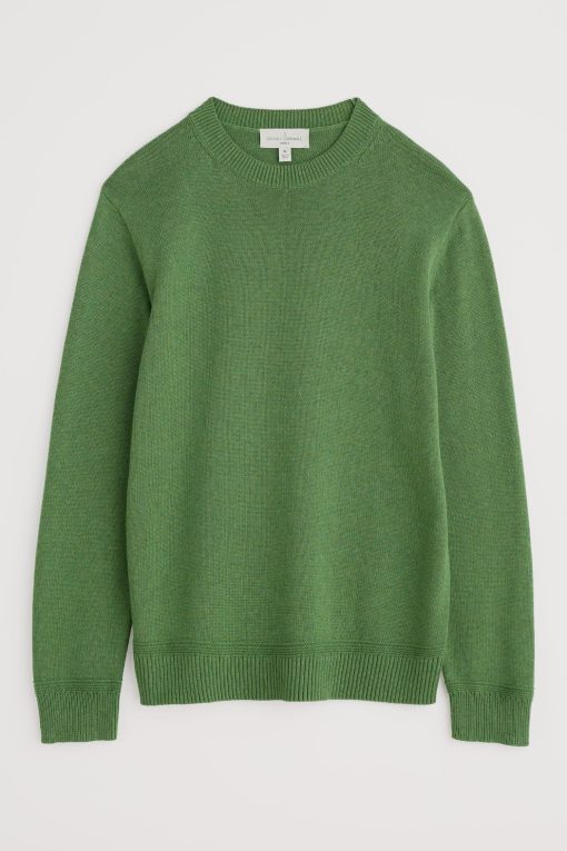 A timeless organic cotton jumper for light and breathable warmth. The all-over 7 gauge jersey stitch gives it a smooth, comfortable feel, while the ribbed cuffs and hem have a subtle racking detail just above for a little subtle structure.