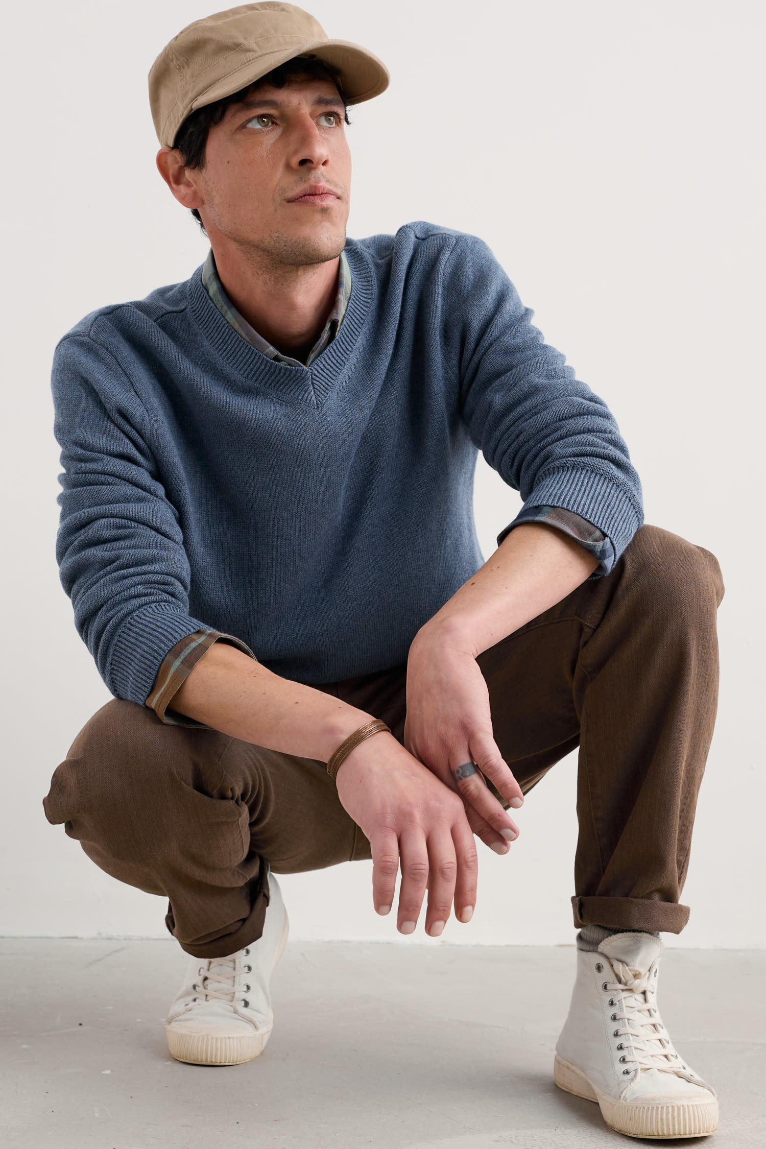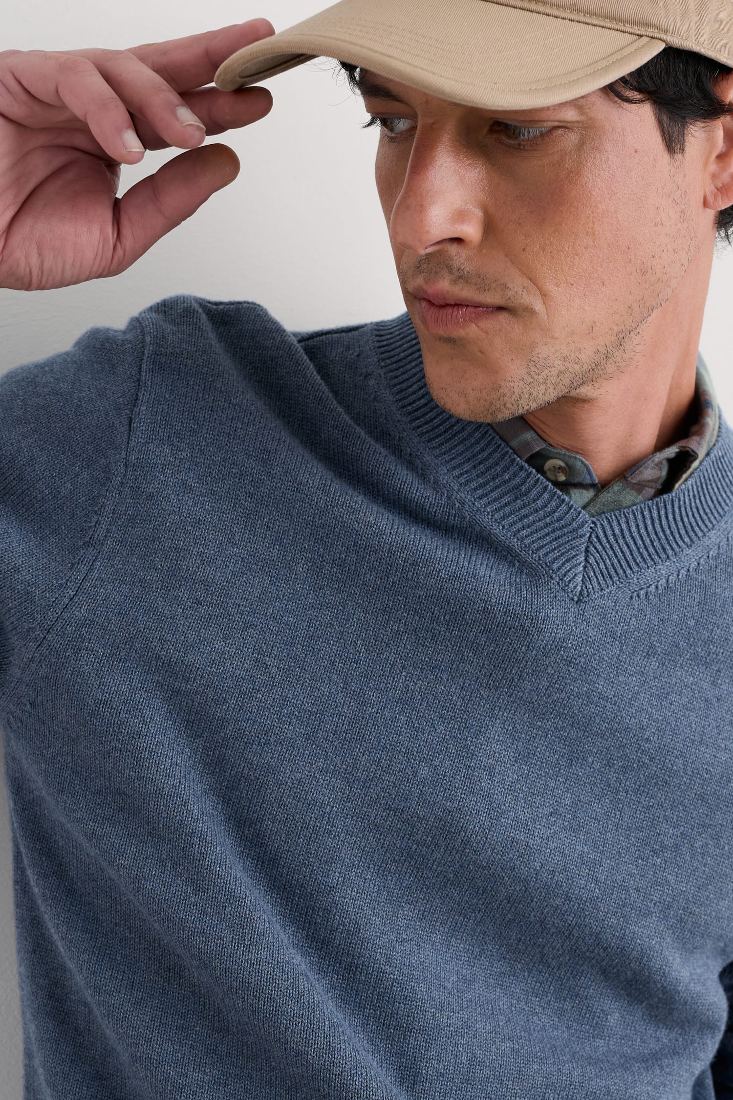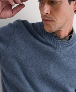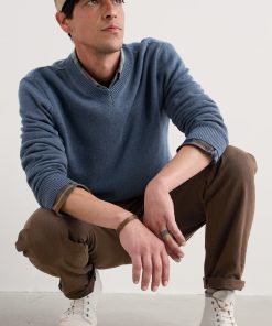 A lightweight but warm jumper, knitted with a 7 gauge jersey stitch from organic cotton yarn. The V-neck looks good over collared shirts or simple T-shirts, and the ribbed cuffs and hem give it an easy shape.