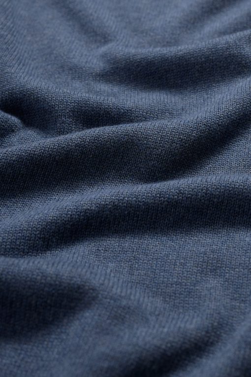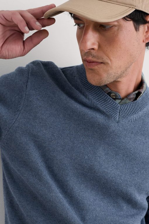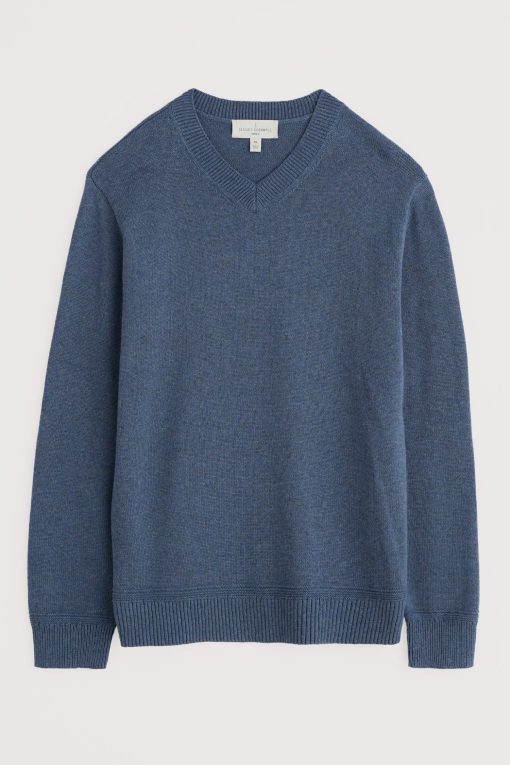 A lightweight but warm jumper, knitted with a 7 gauge jersey stitch from organic cotton yarn. The V-neck looks good over collared shirts or simple T-shirts, and the ribbed cuffs and hem give it an easy shape.