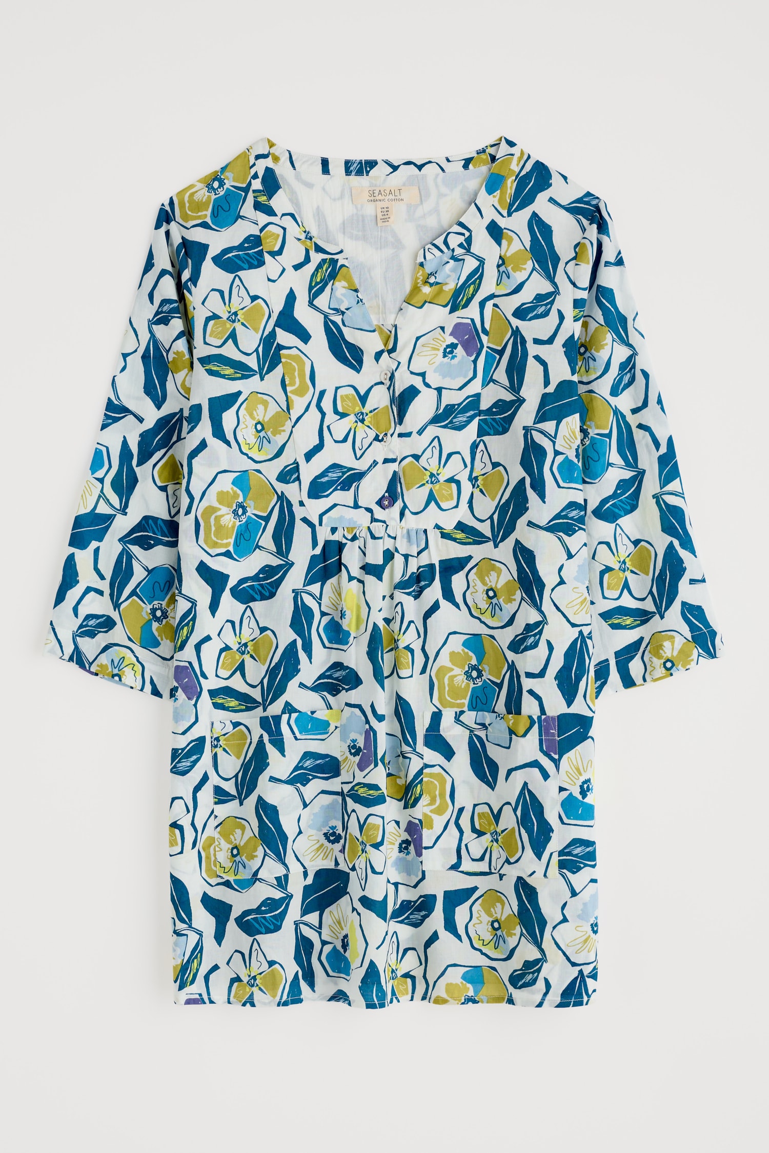 Made from lightweight cotton voile in a unique Seasalt print, our Aventurier Tunic is cut in a loose-fitting smock style, making it super comfortable and cool when the weather warms up. It has 3/4 length sleeves, a pretty notched V neck and two large patch pockets at the front. We think it looks great with leggings and colourful leather sandals.