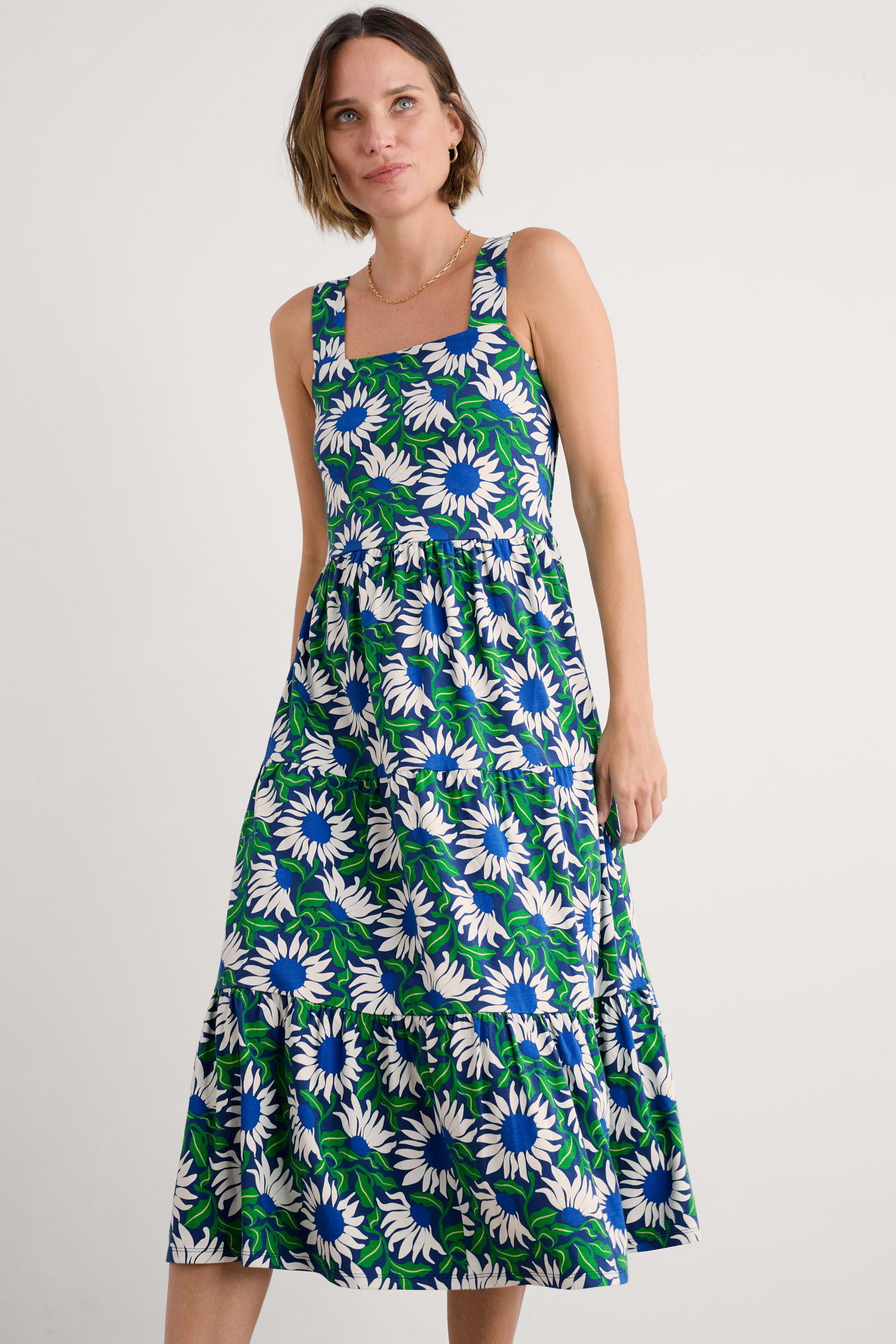 A new summer favourite to take you from the beach to the bar all season long. Made from soft organic cotton with a touch of stretch, we’ve given the Deep Water Dress a flattering square neck with wide straps. Elasticated smocking on the back creates extra space for a comfortable fit, and gathered tiers in the ankle-length skirt give the dress a gentle, floaty movement.