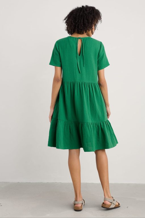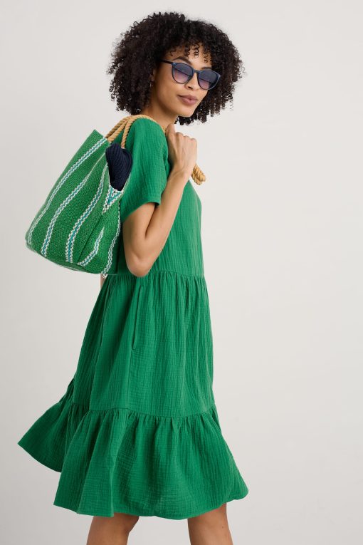 An easy on-the-knee dress with subtle tiers, made from new, beautifully soft and breathable double cloth fabric. Two layers of loose-weave organic cotton are layered together to create a dress that feels airy but substantial, elegant but with a relaxed crinkle. Perfect for holiday packing.