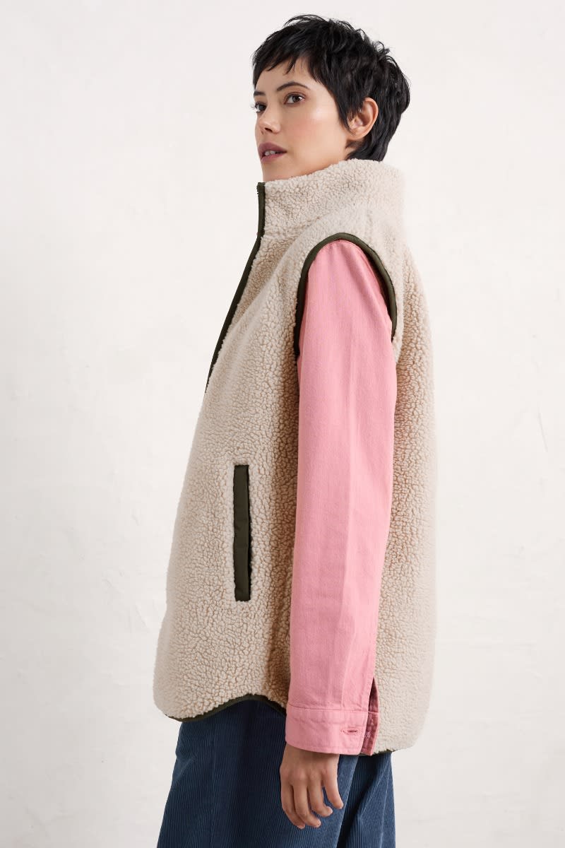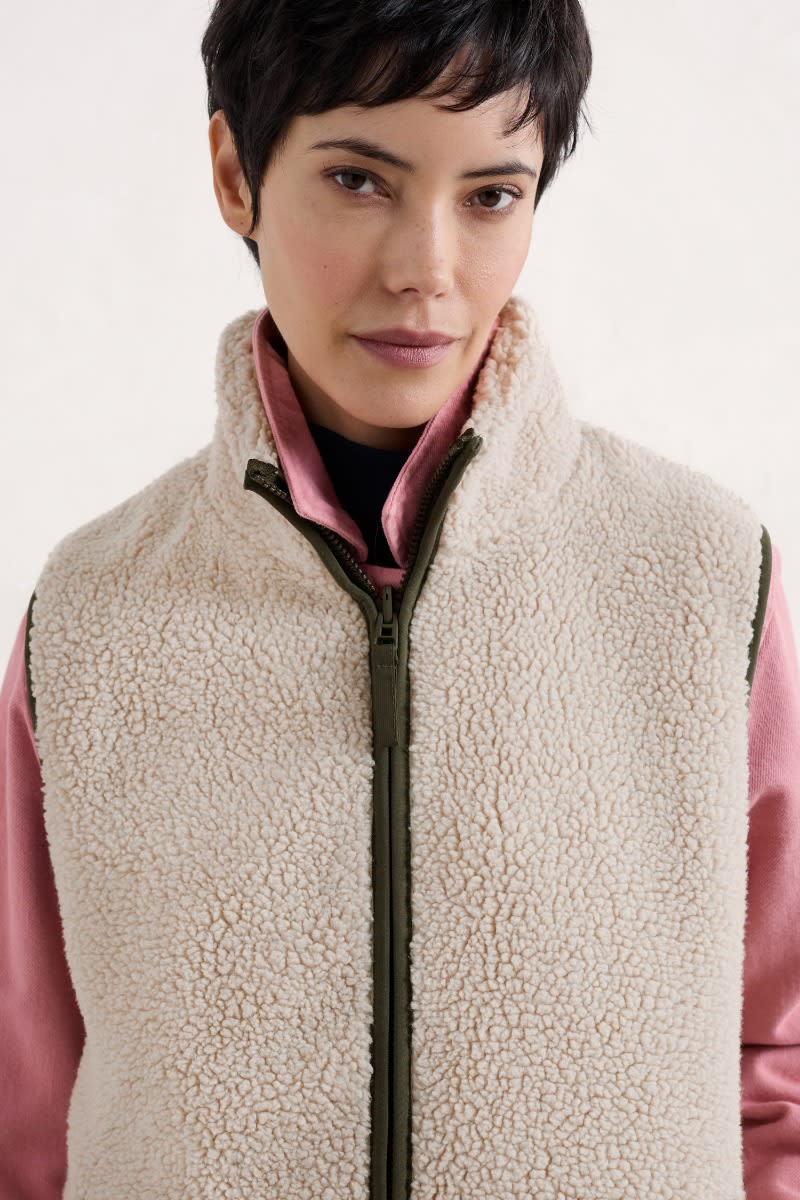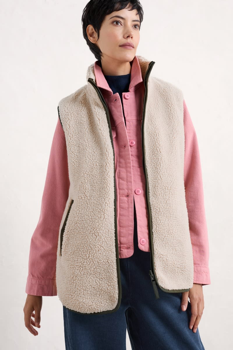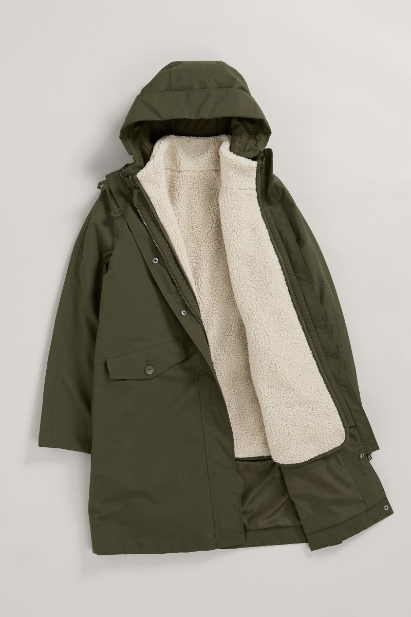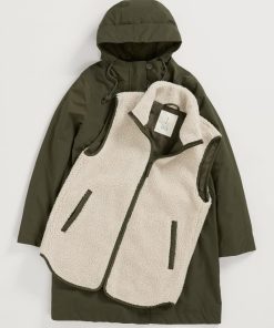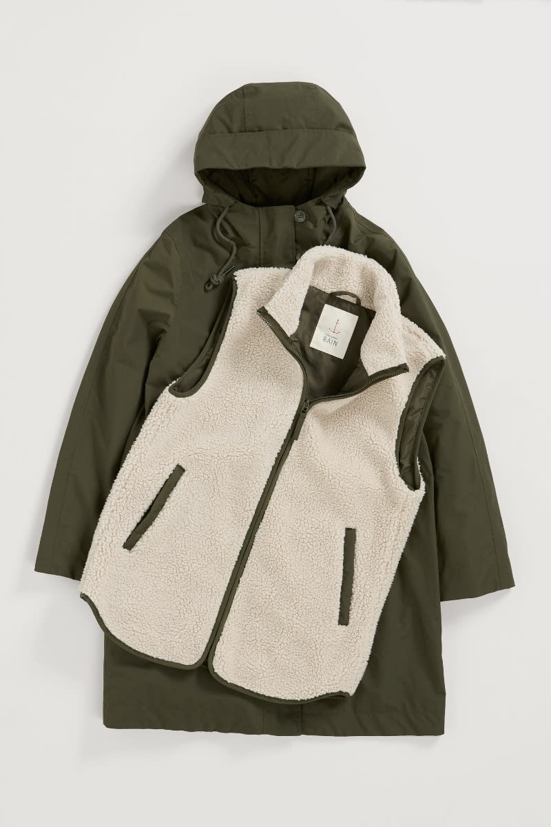 A coat designed in two pieces so it can be worn three different ways, all year round. The simple parka outer is lightly padded, with a drawcord waist, two-way zip and a storm peak on the adjustable hood. The separate, sleeveless inner is made of cosy borg and has contrast trims, dipped hems and pockets. Wear together as a cosy winter coat, or separately as a lightweight waterproof parka and warm, stylish gilet.