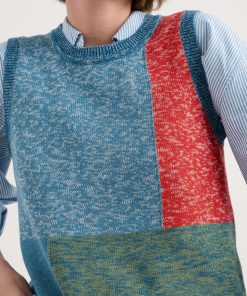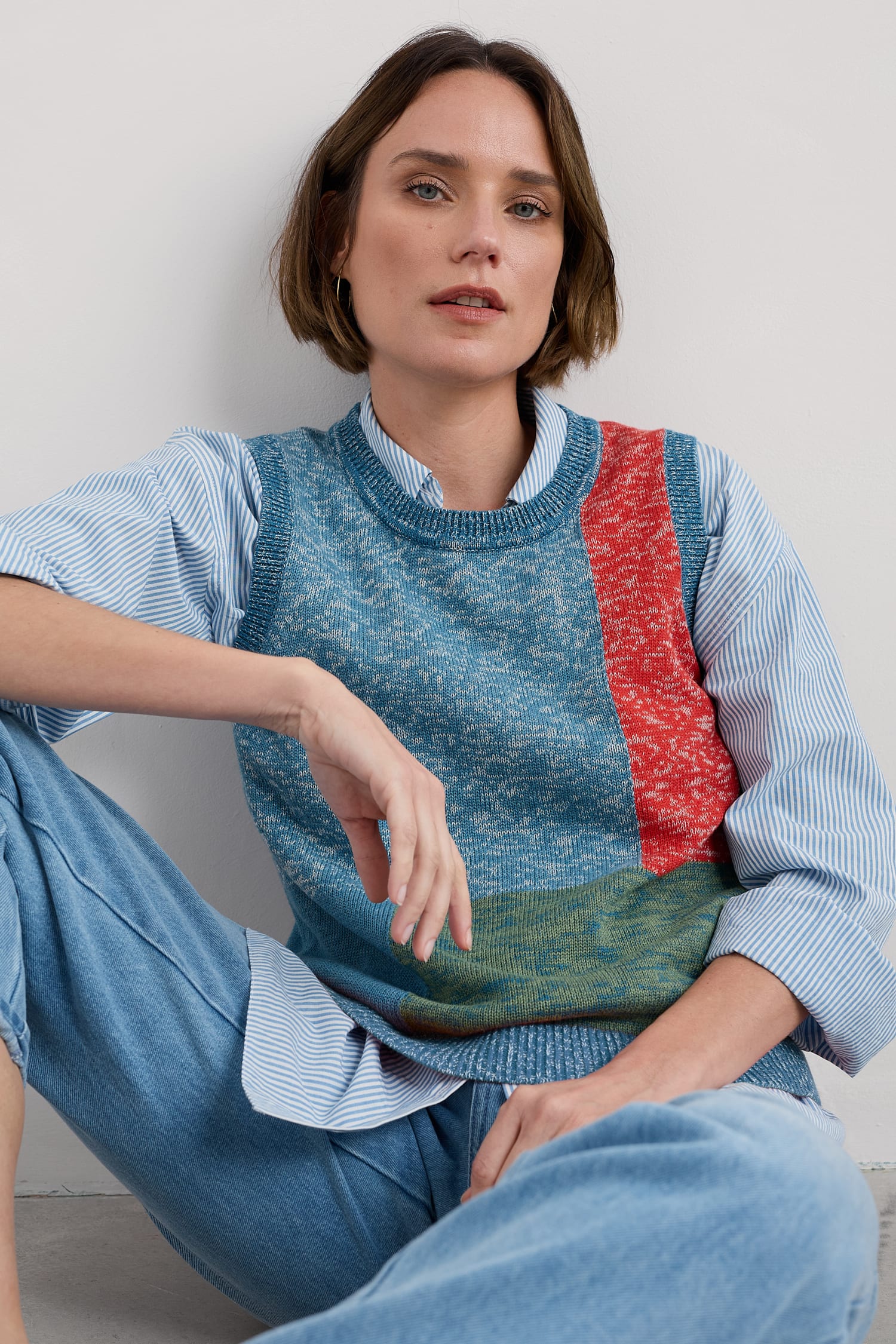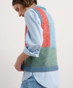 A neat fit vest that makes a colourful statement. Knitted with a pure organic cotton mouline yarn, that blends different coloured . Style over t-shirts or wear on its own.