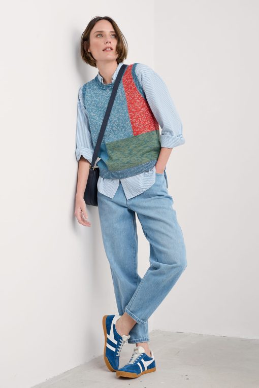 A neat fit vest that makes a colourful statement. Knitted with a pure organic cotton mouline yarn, that blends different coloured . Style over t-shirts or wear on its own.