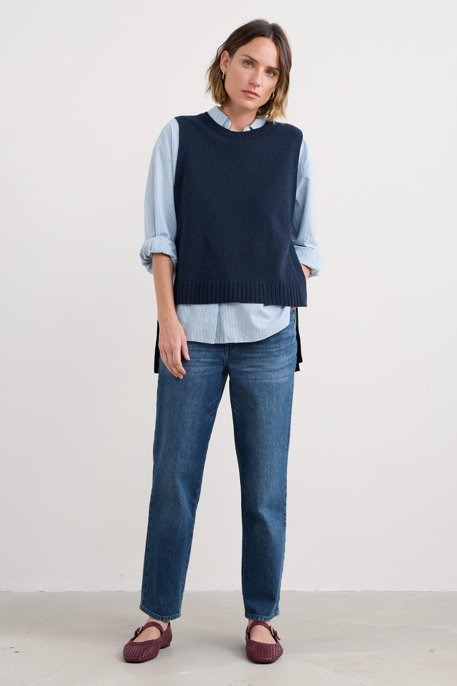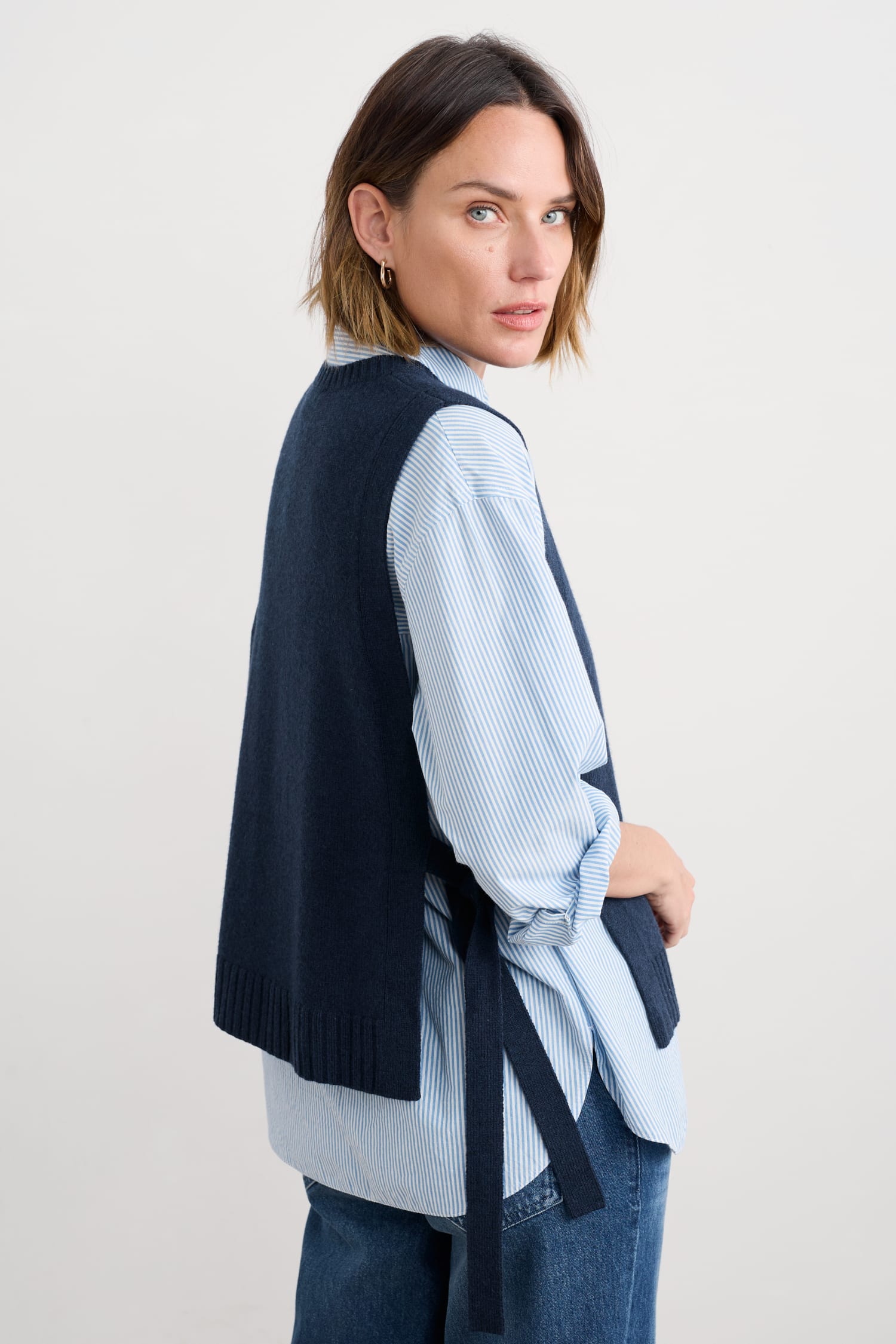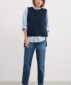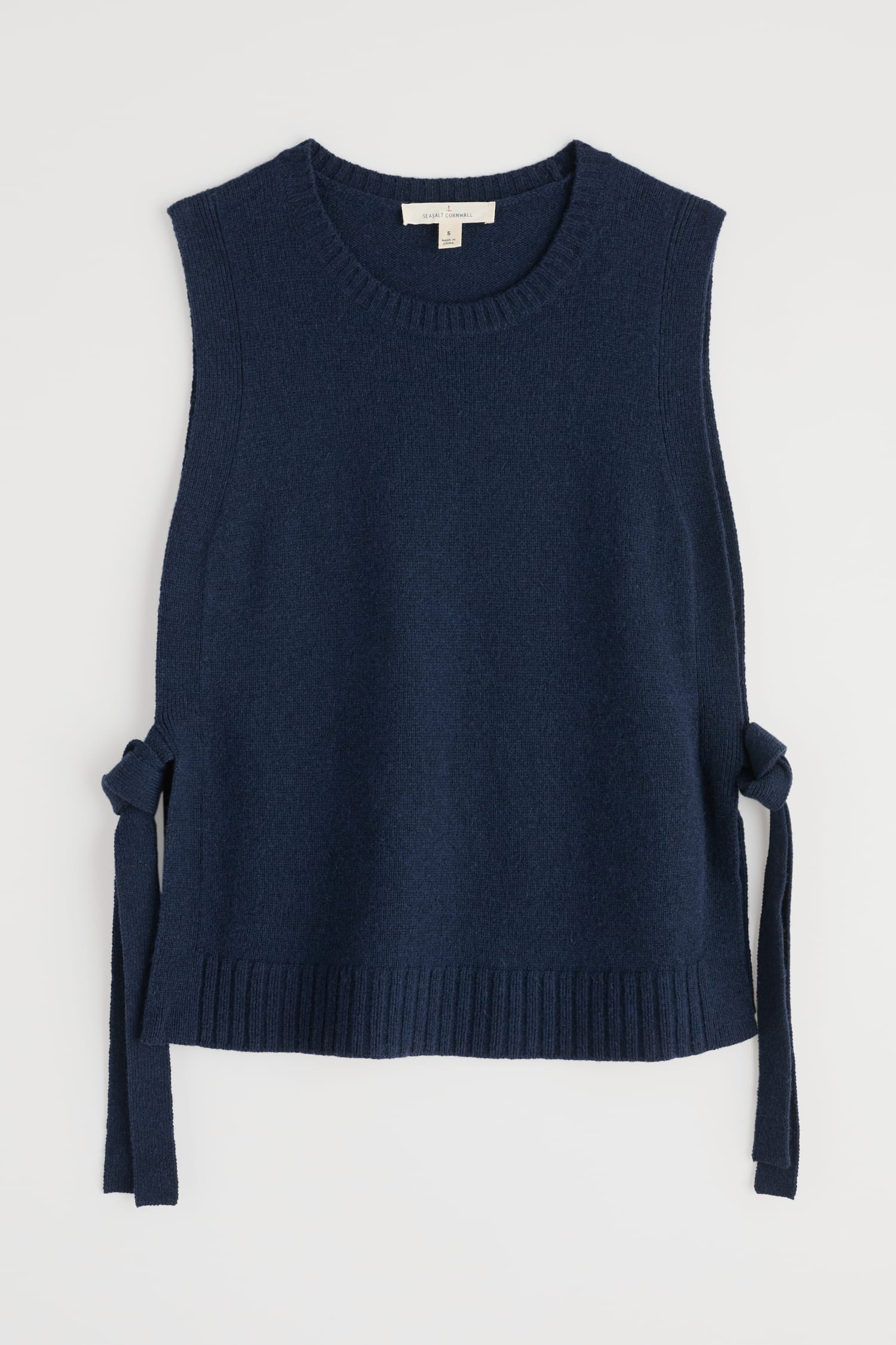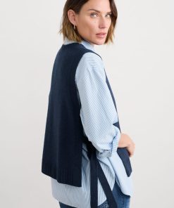 A tabard-style vest knitted in a fine merino-rich yarn blend. The ultimate layering pieces to elevate everyday looks, its full needle rib ties and ribbed trims provide a contemporary twist on classic knitwear, perfect for layering on crisp coastal mornings.
