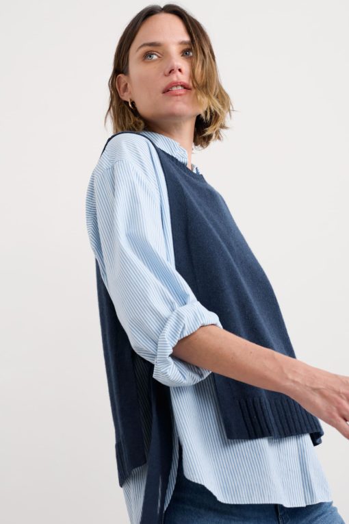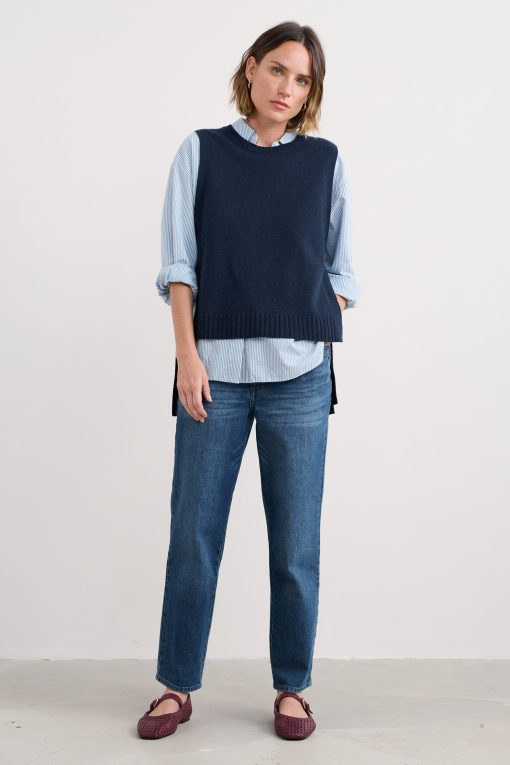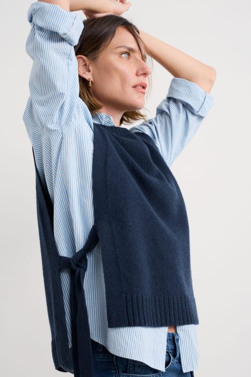 A tabard-style vest knitted in a fine merino-rich yarn blend. The ultimate layering pieces to elevate everyday looks, its full needle rib ties and ribbed trims provide a contemporary twist on classic knitwear, perfect for layering on crisp coastal mornings.