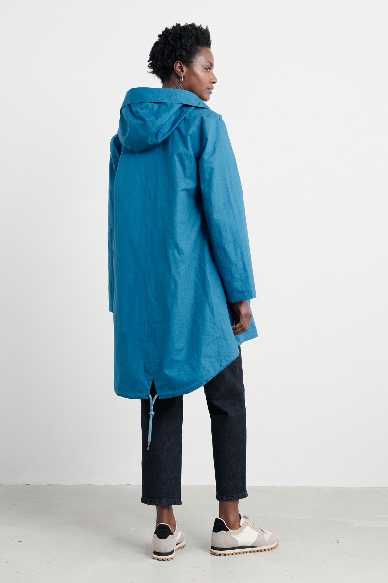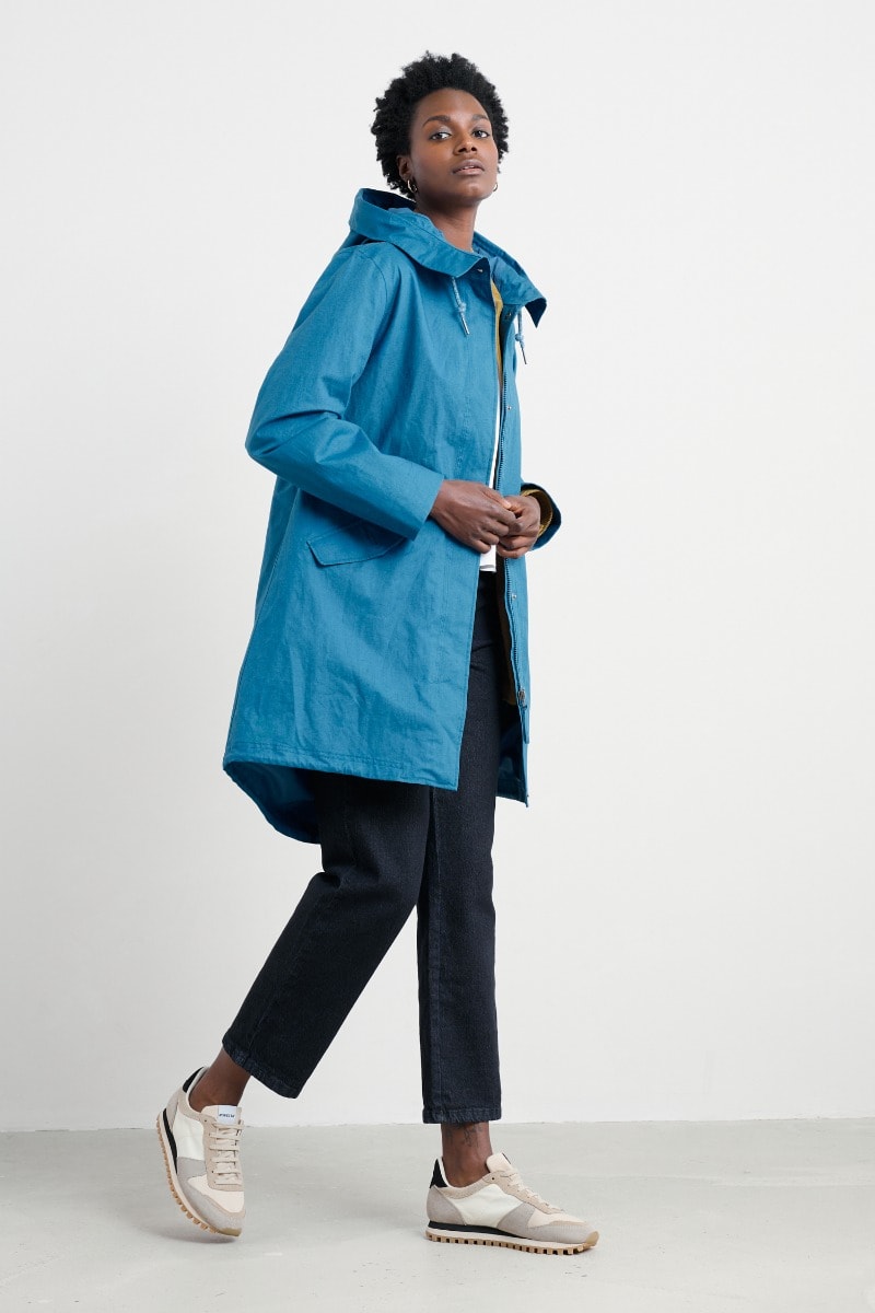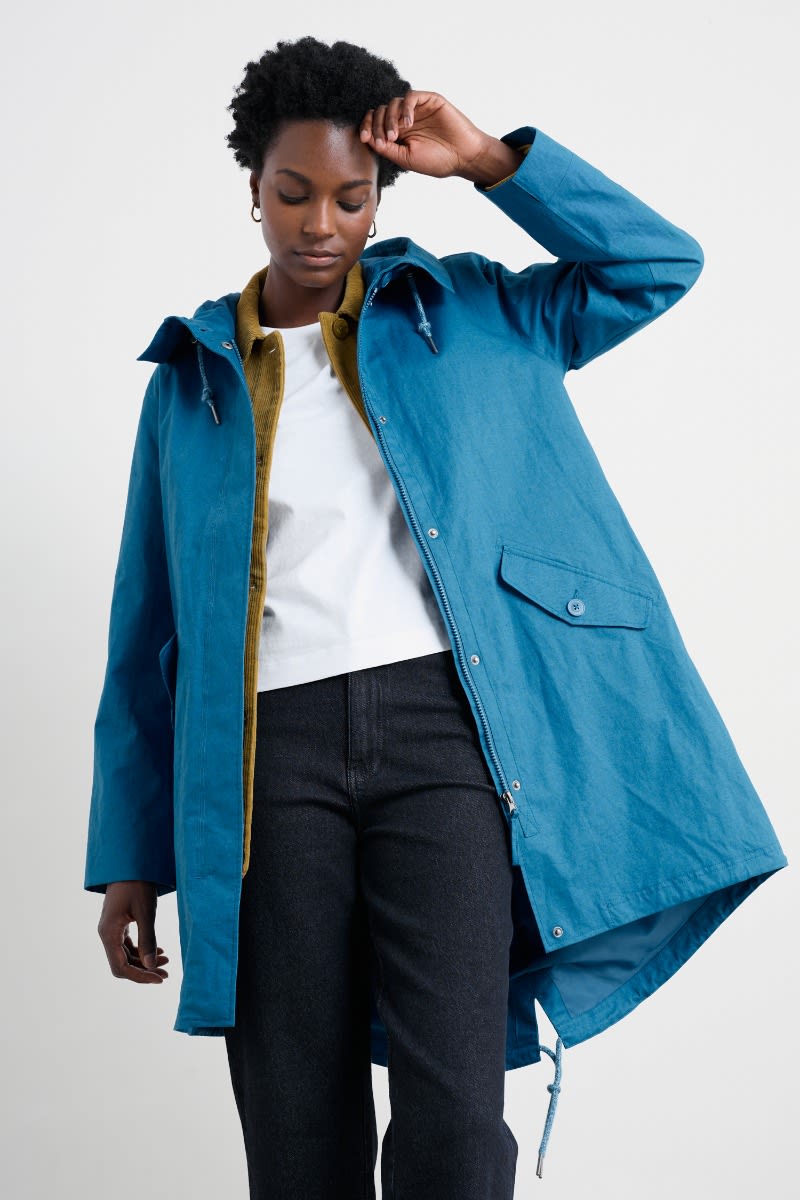 Our Seafaring Coat has a simple, A-line parka shape with fishtail hem, handy buttoned pockets and an internal phone pocket too. Perfect for days outdoors, whether you’re battling the elements by the coast or navigating city streets. Made from a linen and organic cotton blend Tin Cloth® with a cotton lining on the upper body and polyester lining on the arms and lower body.