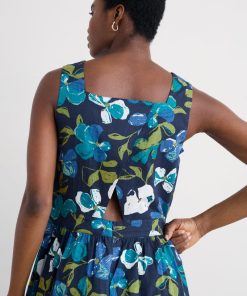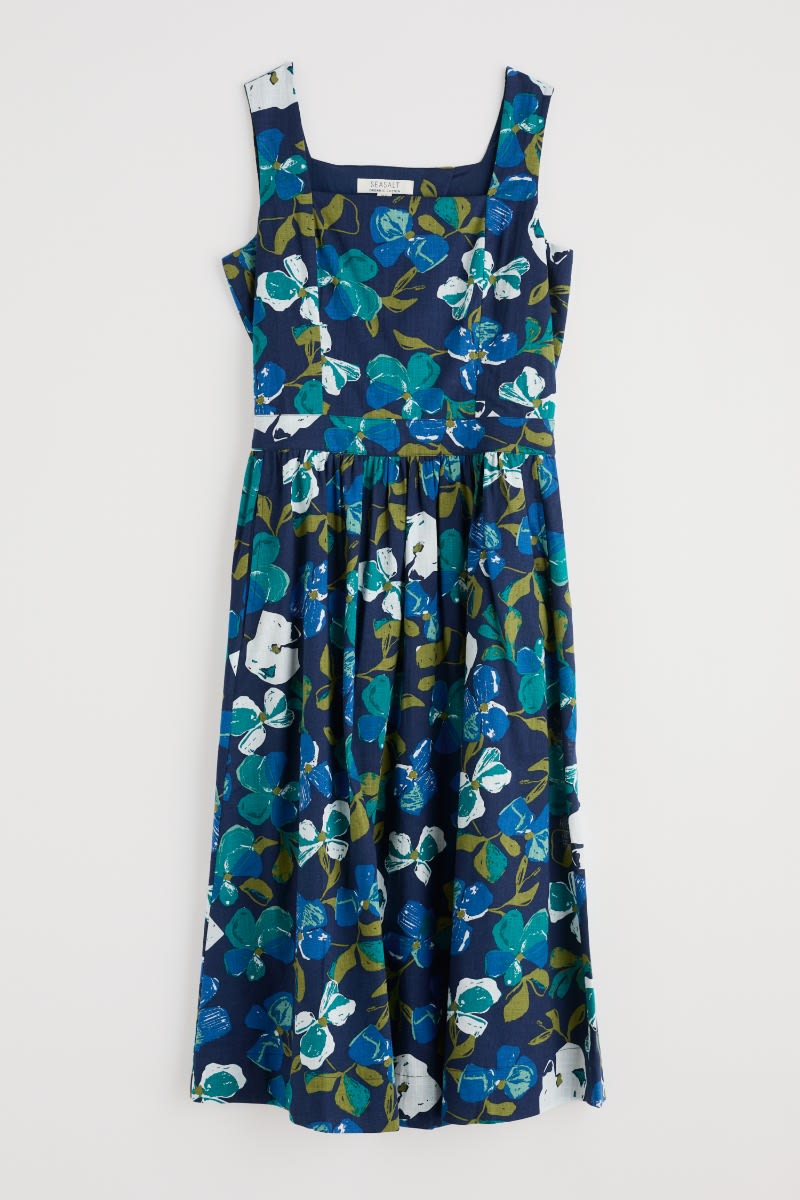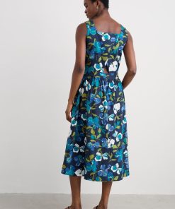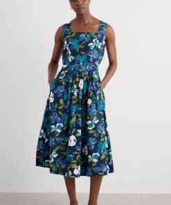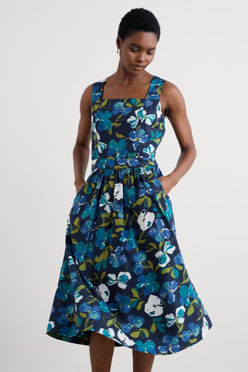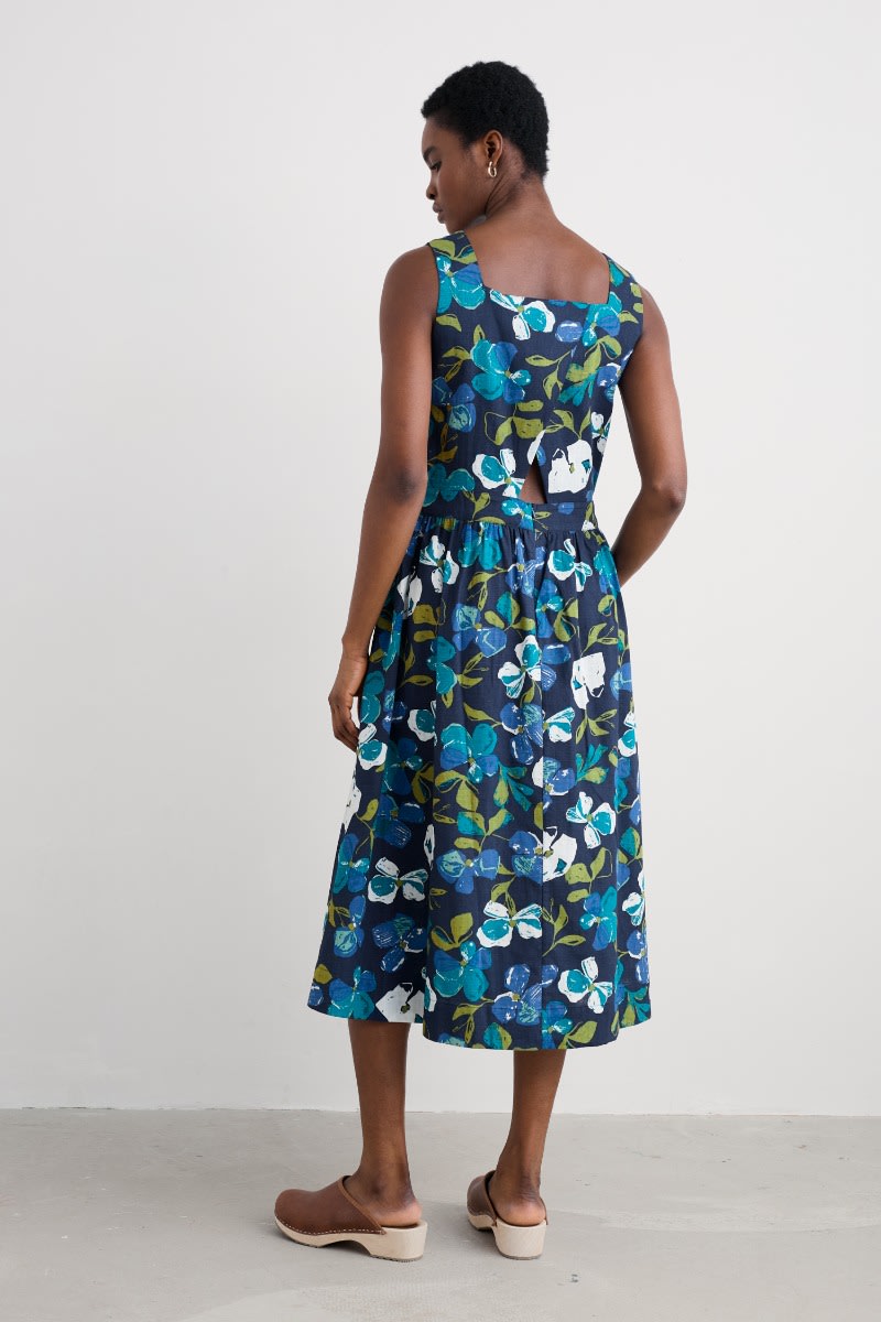 A woven fit-and-flare dress in traceable organic cotton. We’ve given the Shearwater a sophisticated square neckline and cut-out back detail. The skirt is gathered to create a full, swishy look that minimises the waist by floating outwards. It’s fully lined with organic cotton voile, and finished with hidden in-seam pockets.