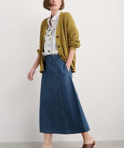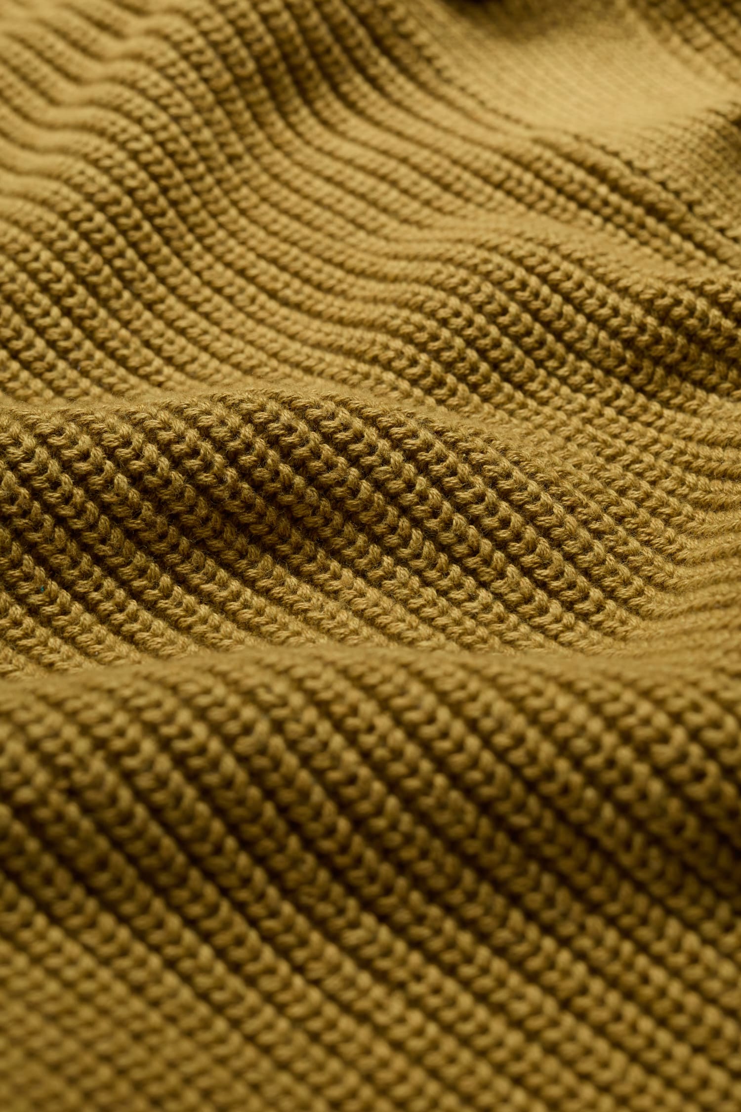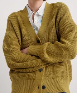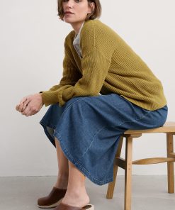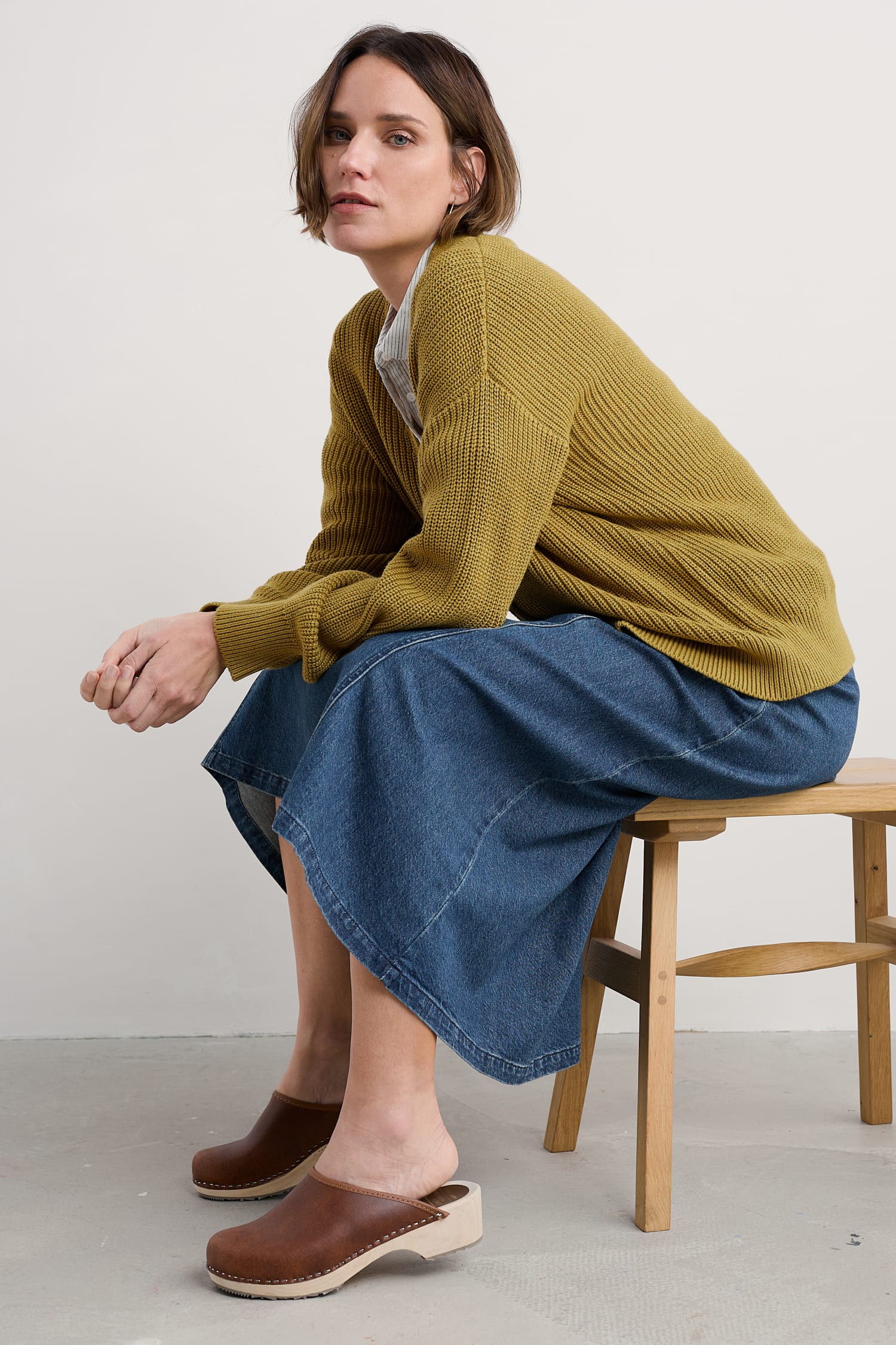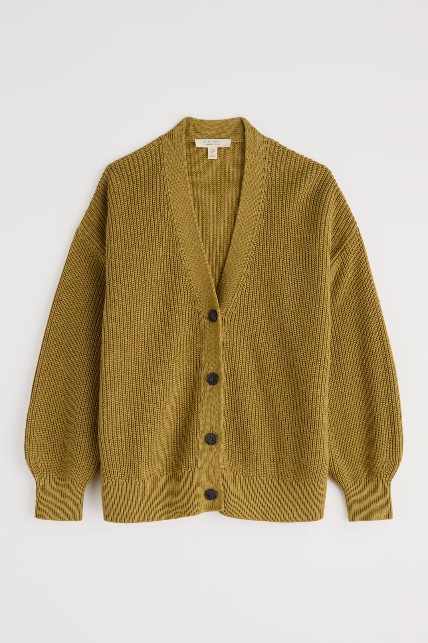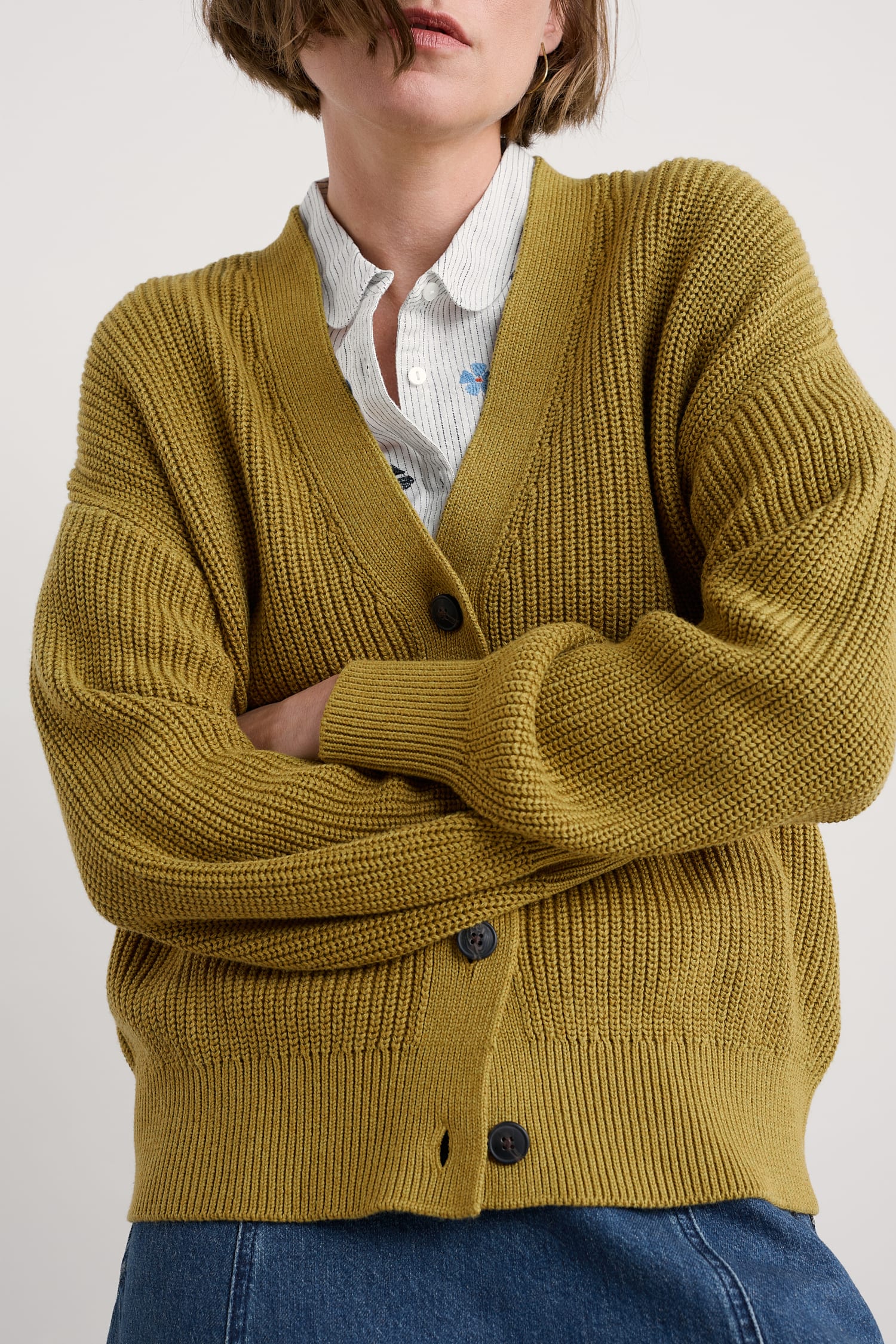 An organic cotton cardigan with a chunky textured rib stitch, designed with dropped shoulders and blouson sleeves to be worn oversized for a stylish slouchy fit. Due to the fabric and knit of this style it may stretch slightly, but should return to its shape upon washing.