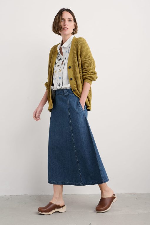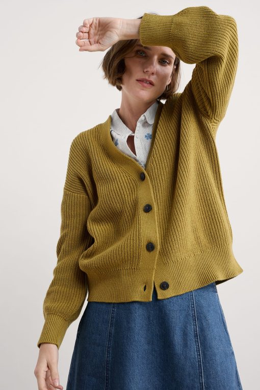 An organic cotton cardigan with a chunky textured rib stitch, designed with dropped shoulders and blouson sleeves to be worn oversized for a stylish slouchy fit. Due to the fabric and knit of this style it may stretch slightly, but should return to its shape upon washing.