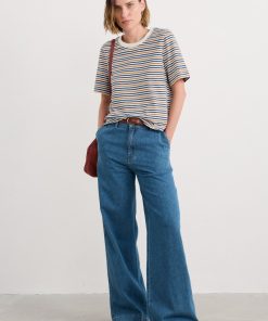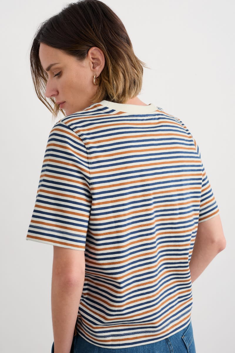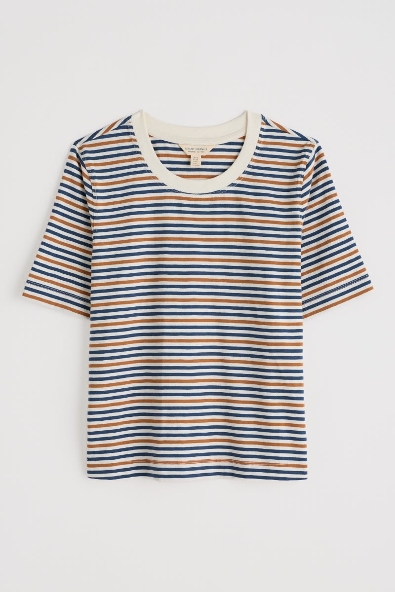 We’ve given the Copseland T-shirt a boxy fit and comfortable ribbed neckline. Made from soft organic cotton jersey in beautiful Cornish colours, it’s a wardrobe staple you’ll find ways to style every day. Designed with a slightly shorter length to look great with high waisted skirts, jeans and trousers.