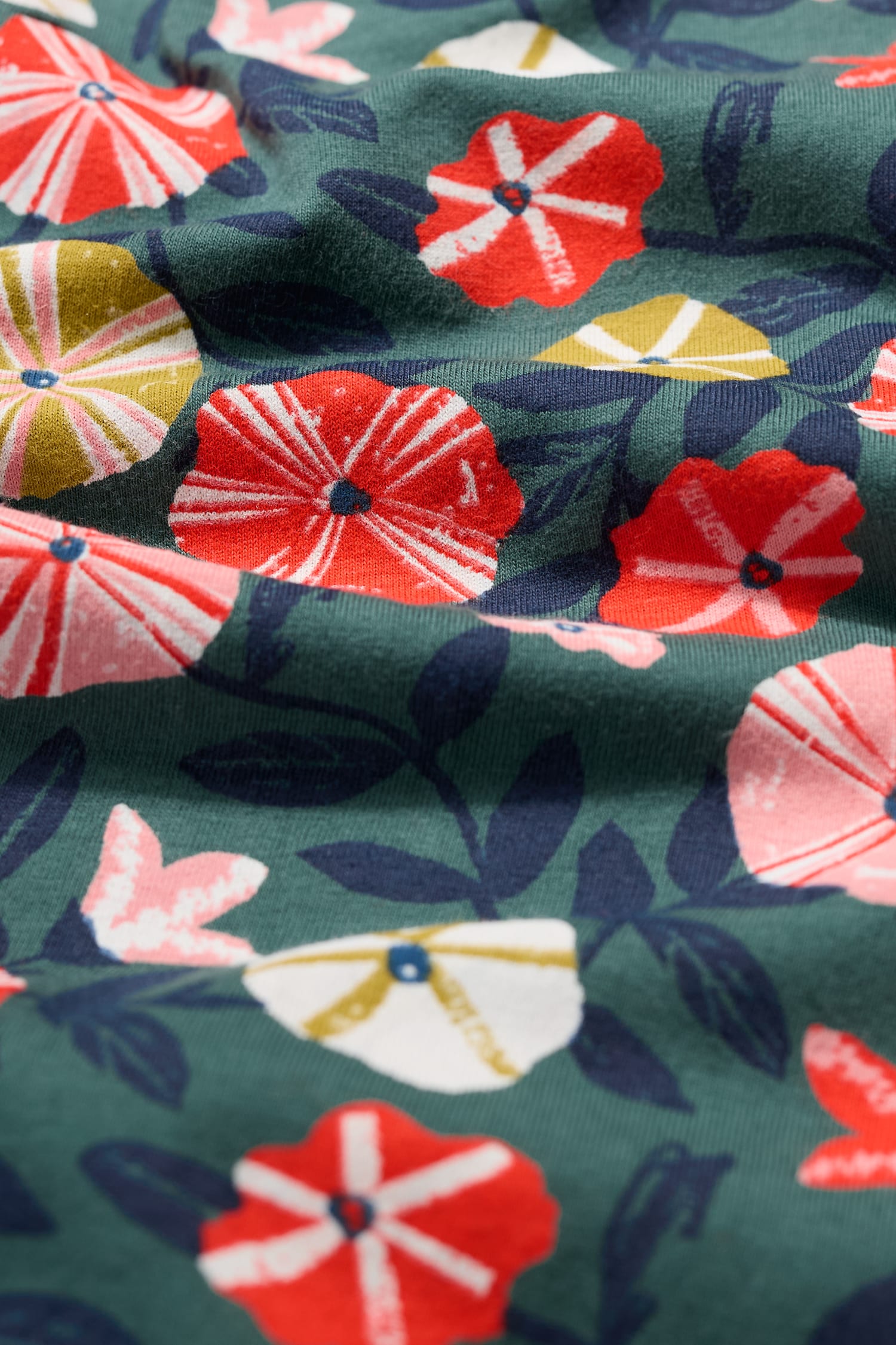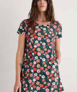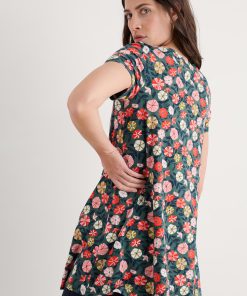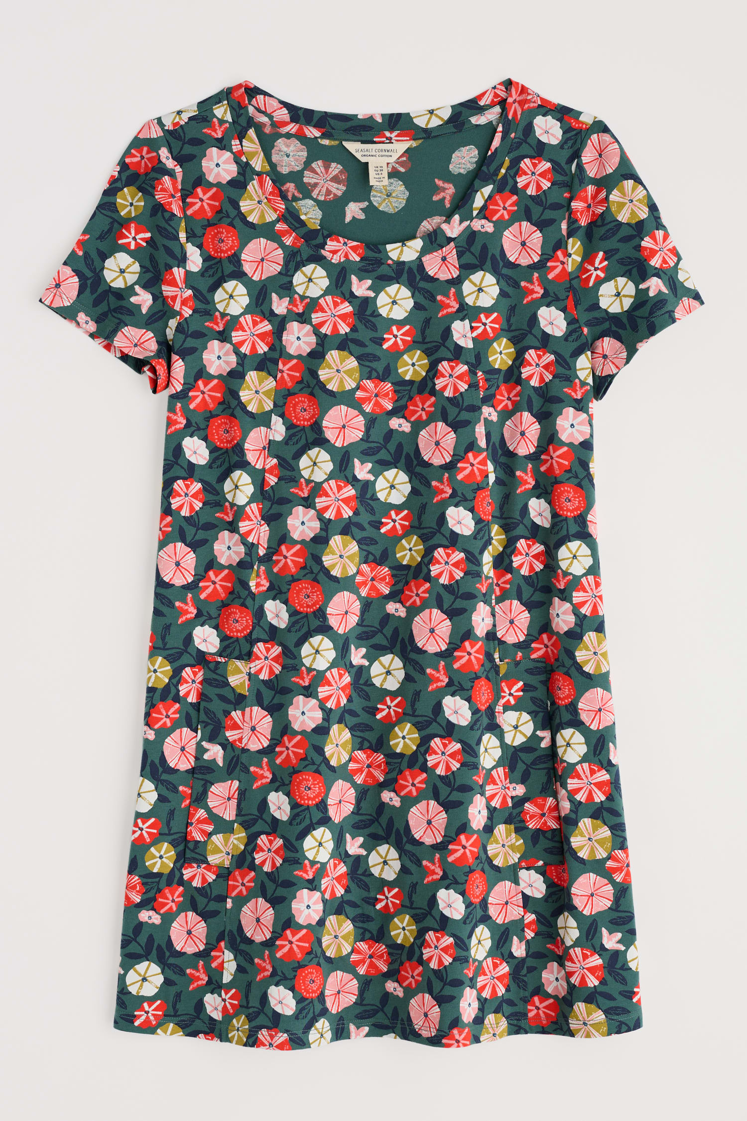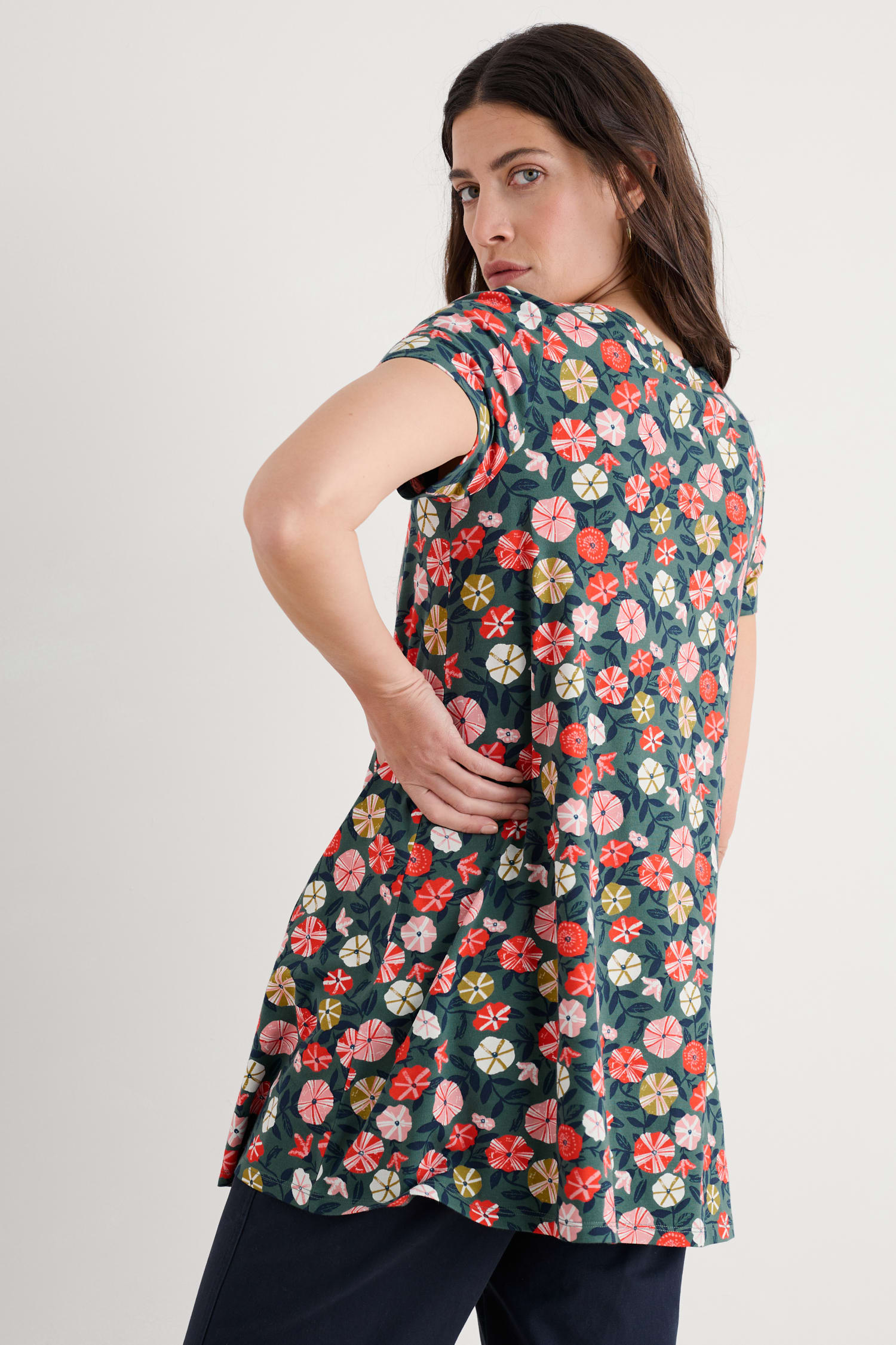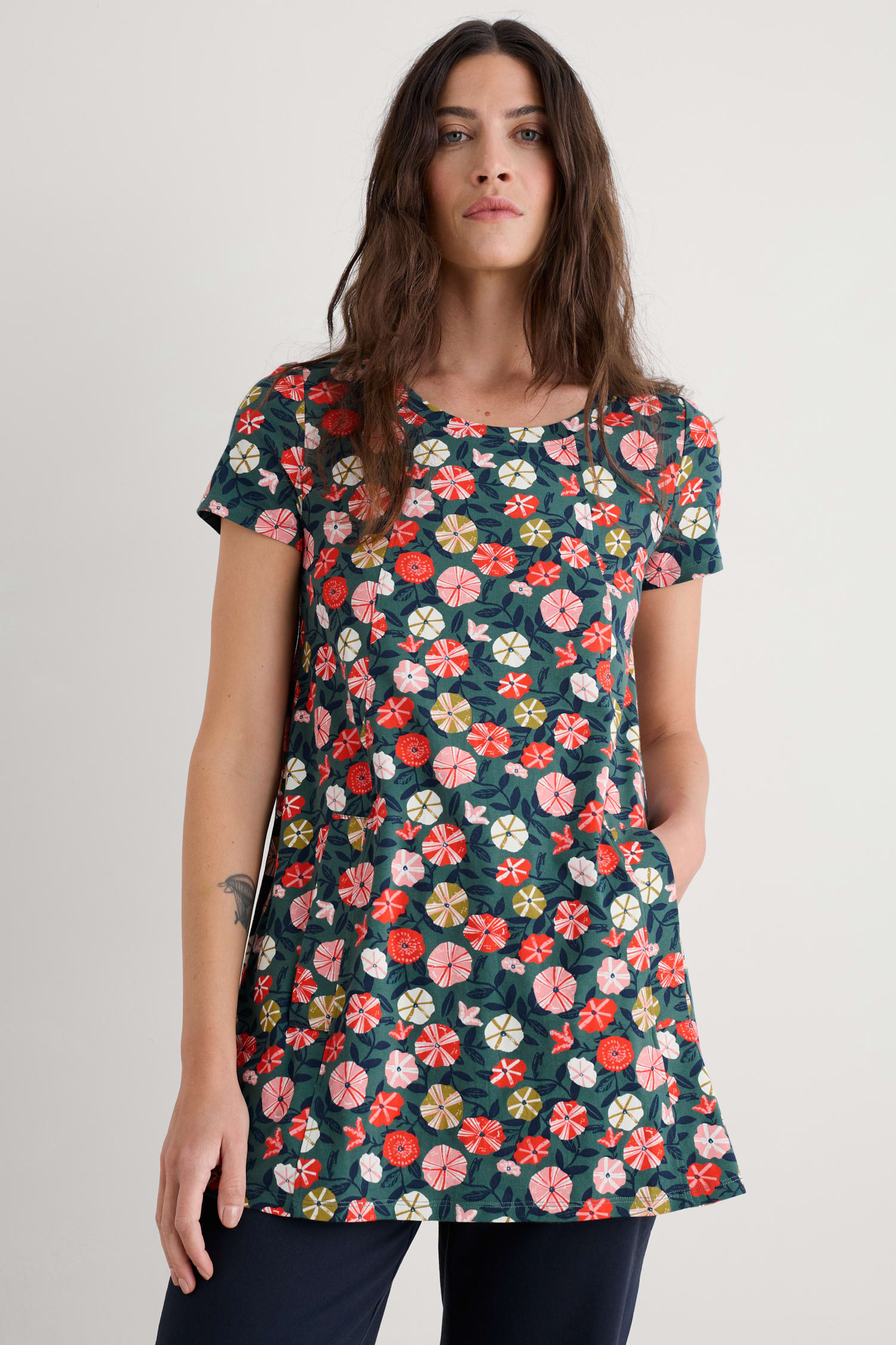 Fresh for the coming season, our short-sleeve jersey tunic blooms in a new floral print. It’s made from soft organic cotton, with a dash of added stretch for comfort and fit. Front seams create a lovely, flowing shape that drapes beautifully as the tunic flares out towards the hem. In-seam welt pockets add a pleasing finishing touch.