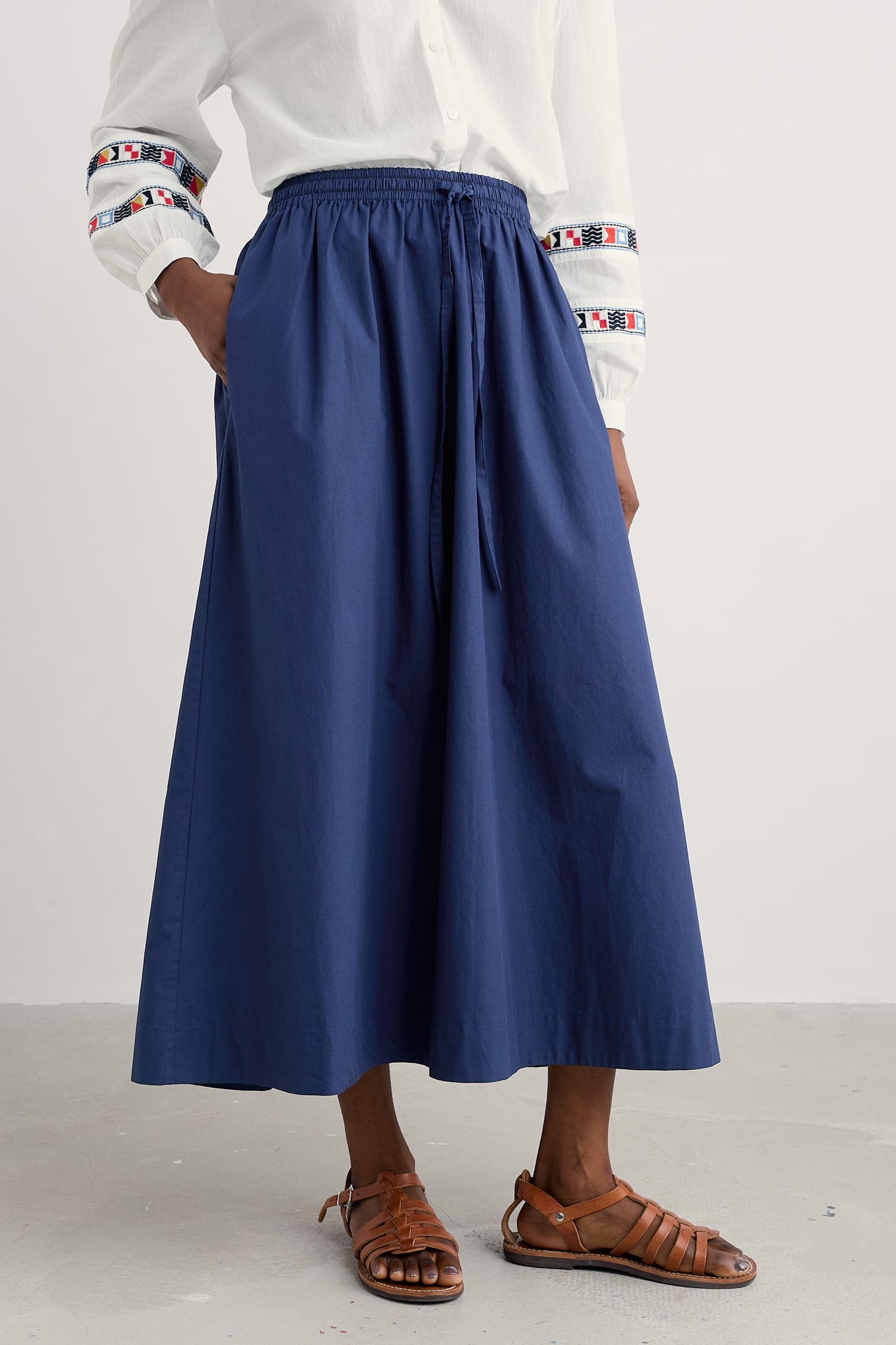 The perfect piece for warmer days, the Lake Skirt is made from GOTS-certified organic cotton with a cool and lightweight poplin weave. The ankle-length skirt is full for a floaty feel, and the elasticated waist makes it a comfortable choice for day-long wear. We’ve finished it with a self-fabric waist tie and those always-appreciated side pockets.