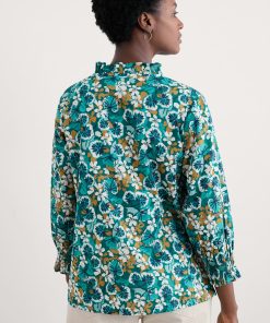 An easy-wearing take on a classic blouse, crafted from GOTS-certified organic cotton. Soft gathers give the blouse a relaxed shape, complemented by gently full, 3/4 length sleeves. Pretty frills around the neck and buttoned placket match those on the smocked cuffs. Fans of our Feather Star Top will recognise the fit of this lovely new piece.