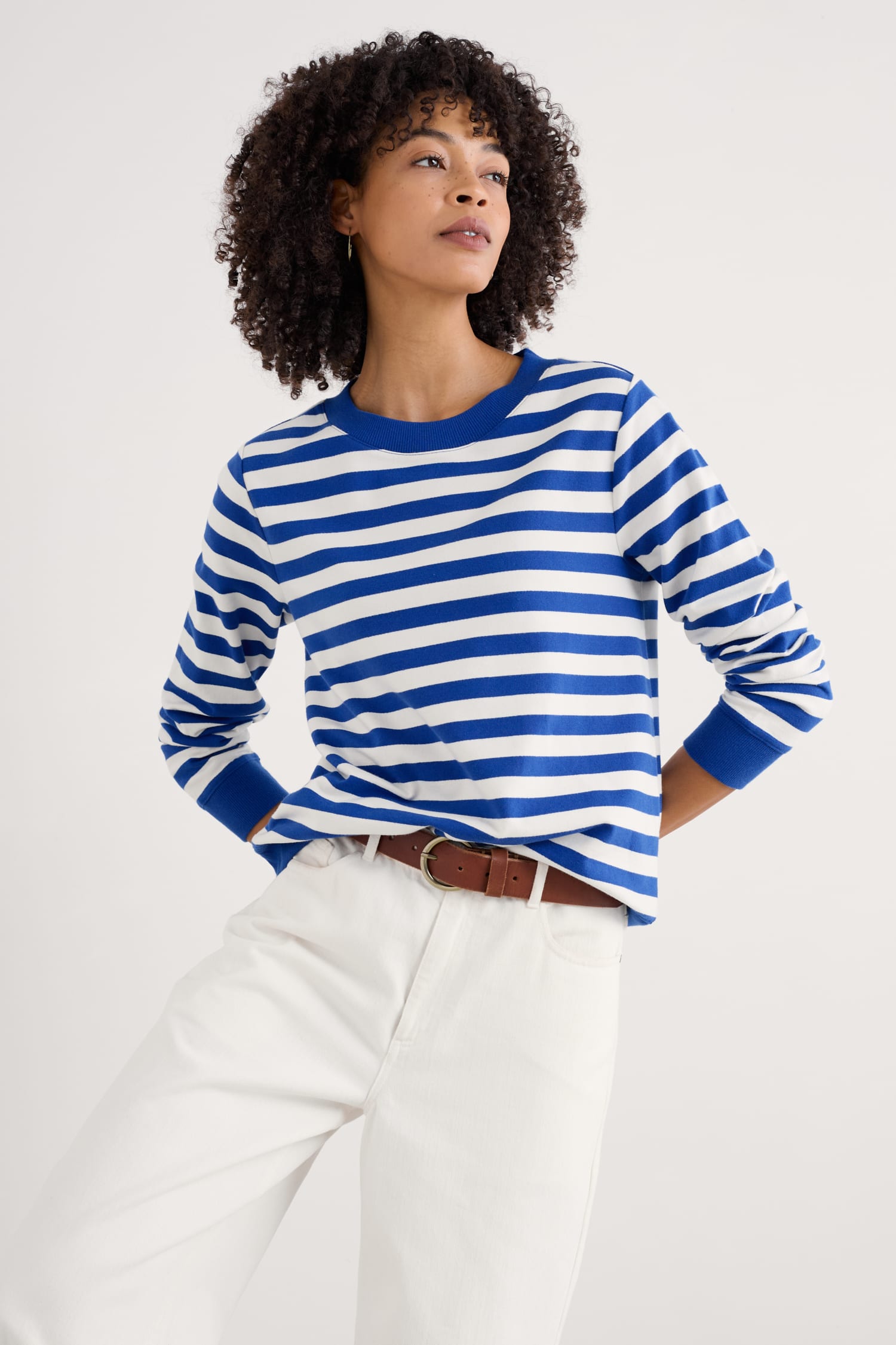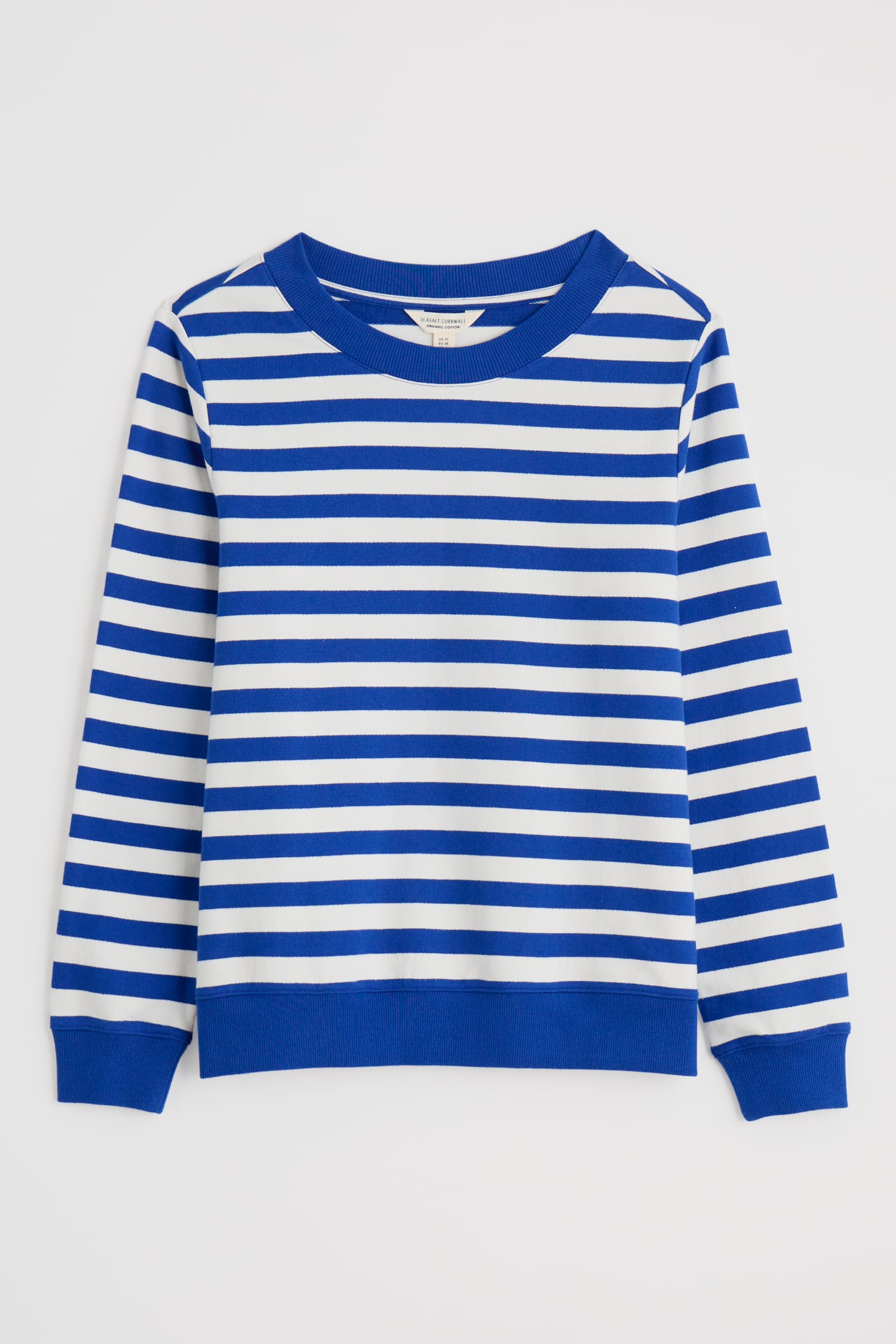 A soft and comfortable jersey sweatshirt made from naturally breathable organic cotton. The stripes are yarn-dyed for deep and lasting colour, in hues inspired by our coastal home. Classic ribbed trims bring a neat finish to the crew neck, cuffs and hem. One to love for seasons to come.