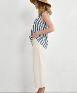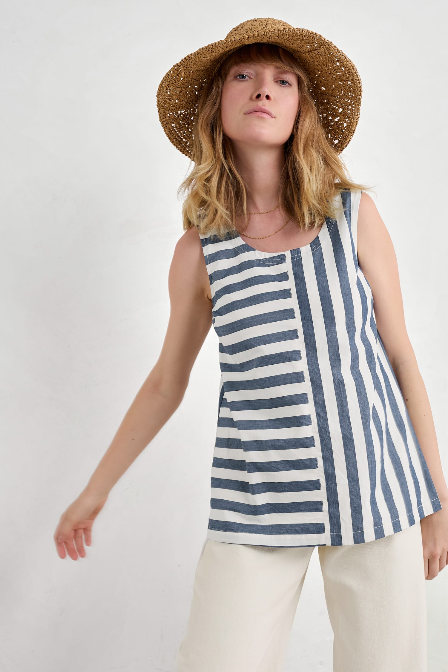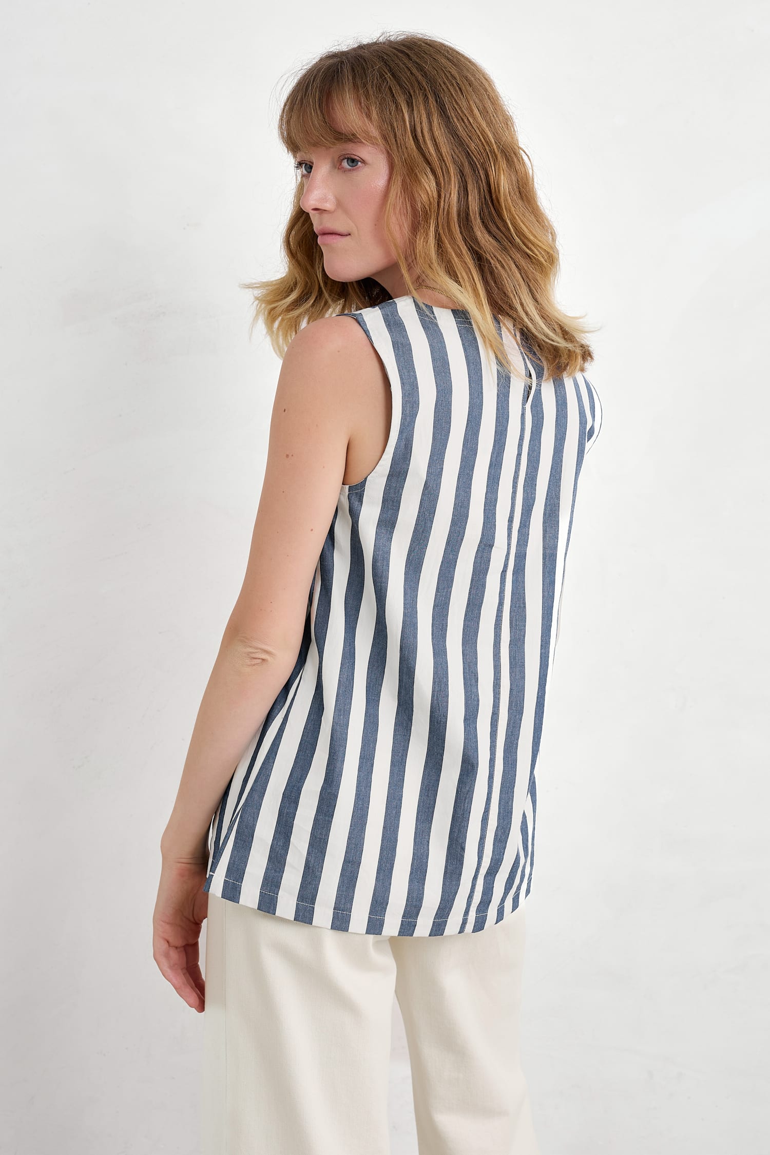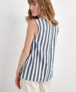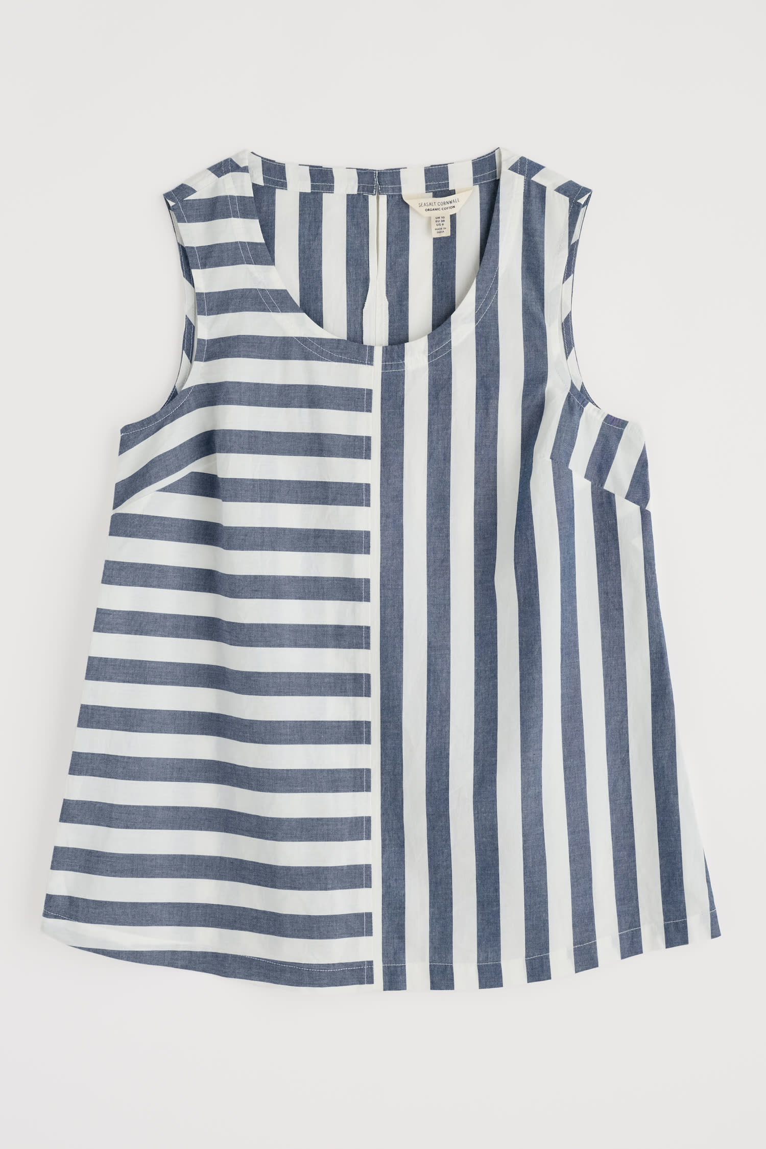 Embrace vertical and horizontal stripes in this bold and cheerful vest, made from soft organic cotton. The sleeveless top has a relaxed swing fit with bust darts for subtle shaping. Its round neckline curves into a keyhole detail at the back with a single button fastening. Those signature stripes are yarn-dyed for a deep and lasting colour.
