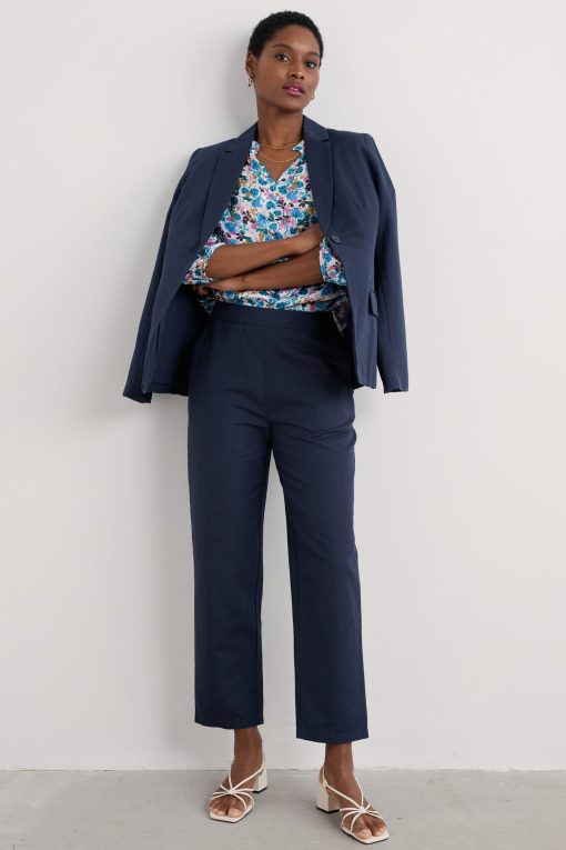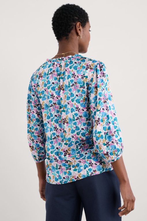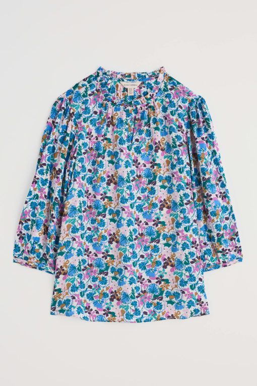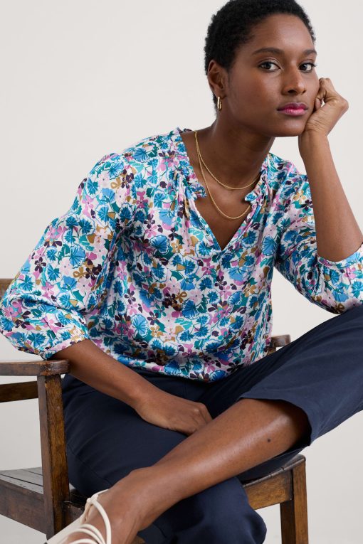 Our Flower Weave top is made from a drapey satin fabric for a soft and airy fit. The volume in the bodice is complemented by the three-quarter blouson sleeves. A frill at the neck dips into a notch neckline, creating a pretty focal point. A lovely piece in an original Seasalt print.