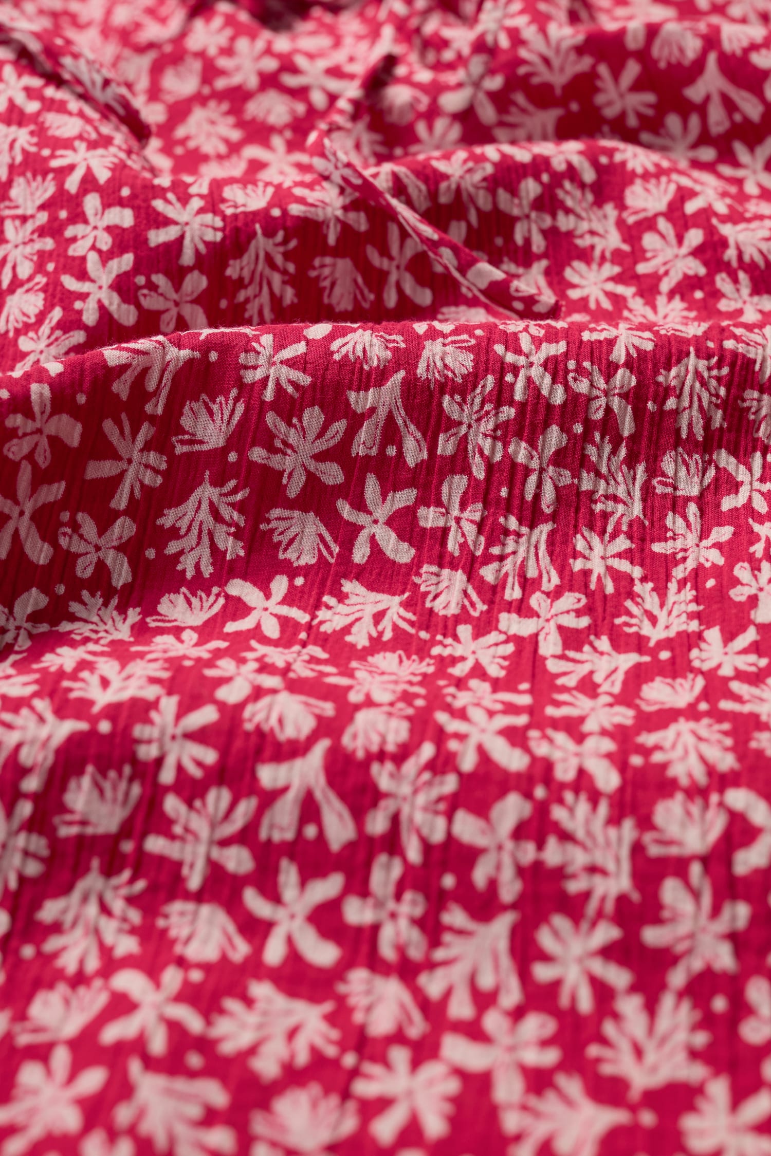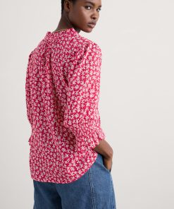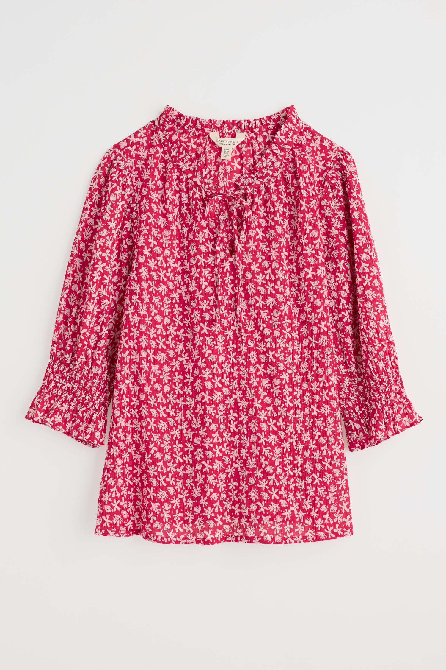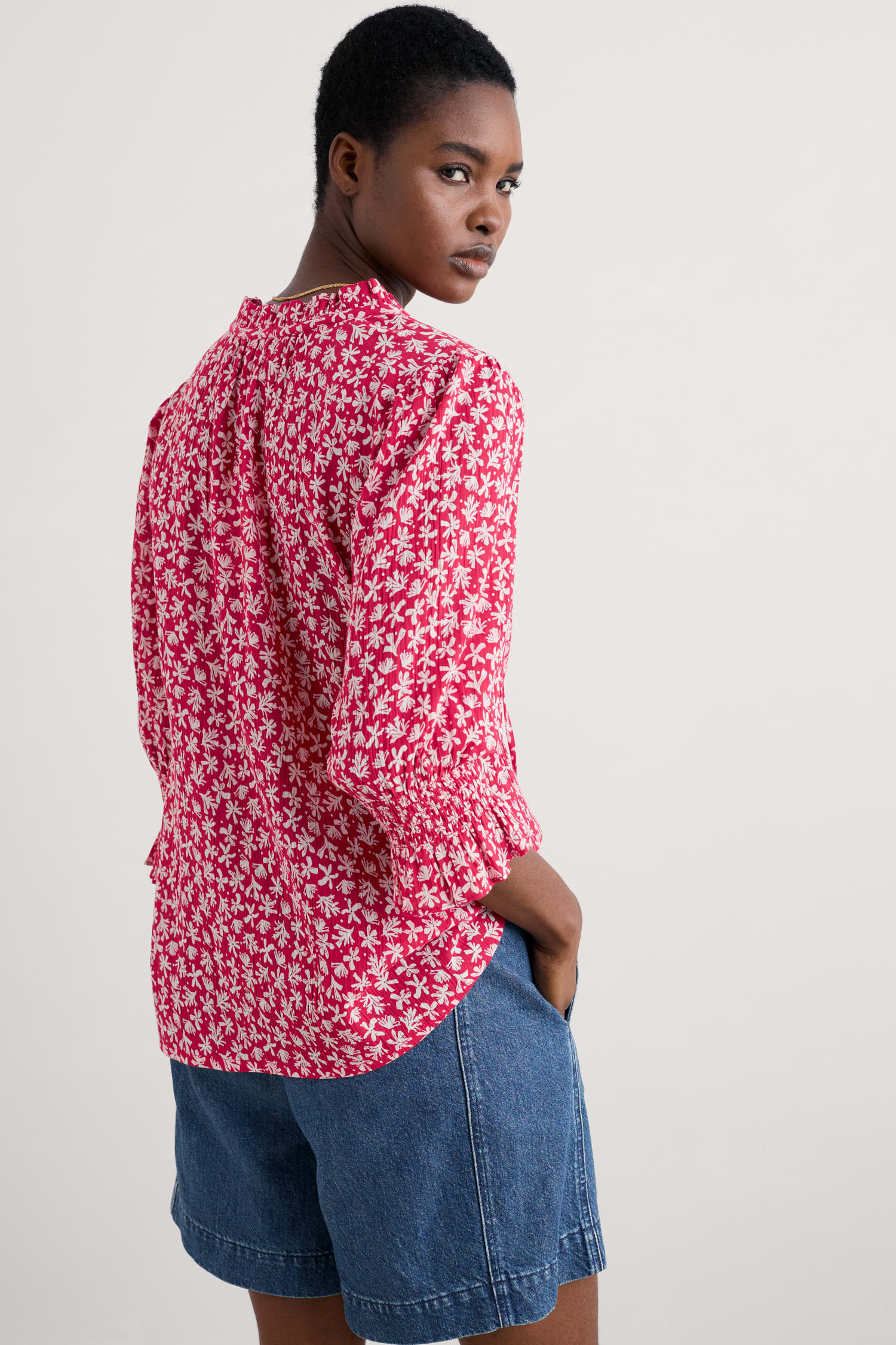 A simple, easy-fitting silhouette with playful details that pairs perfectly with linen shorts or easy crops. The volume of the bell cuffs is created with a little shirred panel below the elbow. Leave the self-fabric ties open to create a stylish V-neckline below the rippling frilled collar.