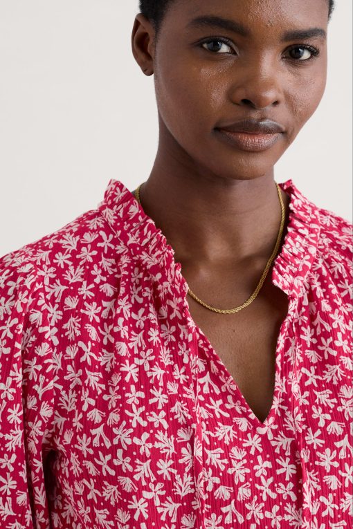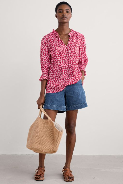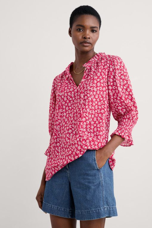 A simple, easy-fitting silhouette with playful details that pairs perfectly with linen shorts or easy crops. The volume of the bell cuffs is created with a little shirred panel below the elbow. Leave the self-fabric ties open to create a stylish V-neckline below the rippling frilled collar.